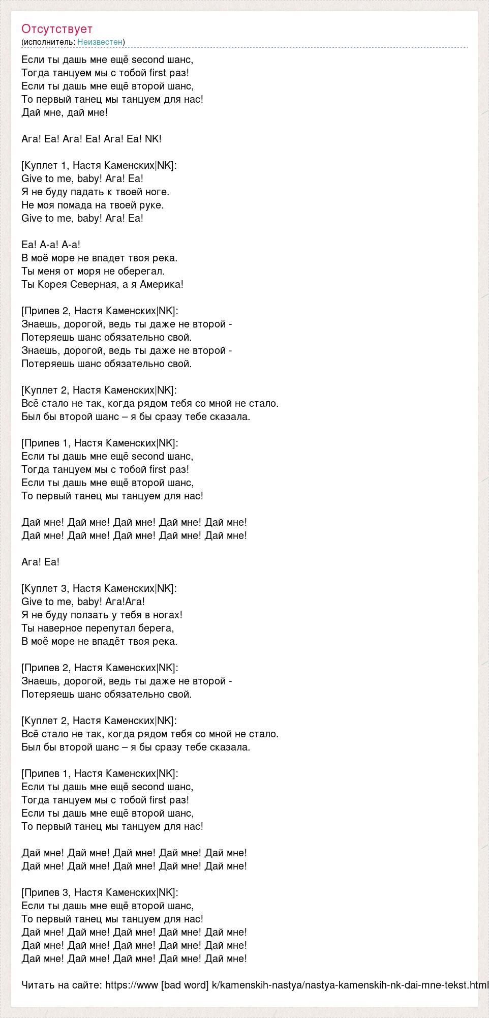 Если ты дашь мне ещё second шанс, Тогда танцуем мы с тобой first раз! Если ты дашь мне ещё второй шанс, То первый танец мы танцуем для нас! Дай мне, дай мне! Ага! Еа! Ага! Еа! Ага! Еа! NK! [Куплет 1, Настя Каменских|NK]: Give to me, baby! Ага! Еа! Я не буду падать к твоей ноге. Не моя помада на твоей руке. Give to me, baby! Ага! Еа! Еа! А-а! А-а! В моё море не впадет твоя река. Ты меня от моря не оберегал. Ты Корея Северная, а я Америка! [Припев 2, Настя Каменских|NK]: Знаешь, дорогой, ведь ты даже не второй - Потеряешь шанс обязательно свой. Знаешь, дорогой, ведь ты даже не второй - Потеряешь шанс обязательно свой. [Куплет 2, Настя Каменских|NK]: Всё стало не так, когда рядом тебя со мной не стало. Был бы второй шанс – я бы сразу тебе сказала. [Припев 1, Настя Каменских|NK]: Если ты дашь мне ещё second шанс, Тогда танцуем мы с тобой first раз! Если ты дашь мне ещё второй шанс, То первый танец мы танцуем для нас! Дай мне! Дай мне! Дай мне! Дай мне! Дай мне! Дай мне! Дай мне! Дай мне! Дай мне! Дай мне! Ага! Еа! [Куплет 3, Настя Каменских|NK]: Give to me, baby! Ага!Ага! Я не буду ползать у тебя в ногах! Ты наверное перепутал берега, В моё море не впадёт твоя река. [Припев 2, Настя Каменских|NK]: Знаешь, дорогой, ведь ты даже не второй - Потеряешь шанс обязательно свой. [Куплет 2, Настя Каменских|NK]: Всё стало не так, когда рядом тебя со мной не стало. Был бы второй шанс – я бы сразу тебе сказала. [Припев 1, Настя Каменских|NK]: Если ты дашь мне ещё second шанс, Тогда танцуем мы с тобой first раз! Если ты дашь мне ещё второй шанс, То первый танец мы танцуем для нас! Дай мне! Дай мне! Дай мне! Дай мне! Дай мне! Дай мне! Дай мне! Дай мне! Дай мне! Дай мне! [Припев 3, Настя Каменских|NK]: Если ты дашь мне ещё второй шанс, То первый танец мы танцуем для нас! Дай мне! Дай мне! Дай мне! Дай мне! Дай мне! Дай мне! Дай мне! Дай мне! Дай мне! Дай мне! Дай мне! Дай мне! Дай мне! Дай мне! Дай мне! Читать на сайте: https://www [bad word] k/kamenskih-nastya/nastya-kamenskih-nk-dai-mne-tekst.html