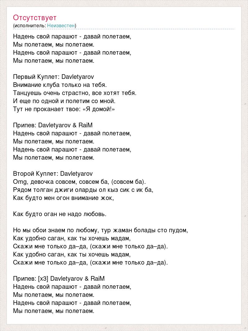 Надень свой парашют - давай полетаем, Мы полетаем, мы полетаем. Надень свой парашют - давай полетаем, Мы полетаем, мы полетаем. Первый Куплет: Davletyarov Внимание клуба только на тебя. Танцуешь очень страстно, все хотят тебя. И еще по одной и полетим со мной. Тут не проканает твое: «Я домой!» Припев: Davletyarov & RaiM Надень свой парашют - давай полетаем, Мы полетаем, мы полетаем. Надень свой парашют - давай полетаем, Мы полетаем, мы полетаем. Второй Куплет: Davletyarov Оmg, девочка совсем, совсем ба, (совсем ба). Рядом толган джиги оларды ол кыз сик с ик ба, Как будто мен огон внимание жок, Как будто оган не надо любовь. Но мы обои знаем по любому, тур жаман болады сто пудом, Как удобно саган, как ты хочешь мадам, Скажи мне только да–да, (скажи мне только да–да). Как удобно саган, как ты хочешь мадам, Скажи мне только да–да, (скажи мне только да–да). Припев: [x3] Davletyarov & RaiM Надень свой парашют - давай полетаем, Мы полетаем, мы полетаем. Надень свой парашют - давай полетаем, Мы полетаем, мы полетаем.