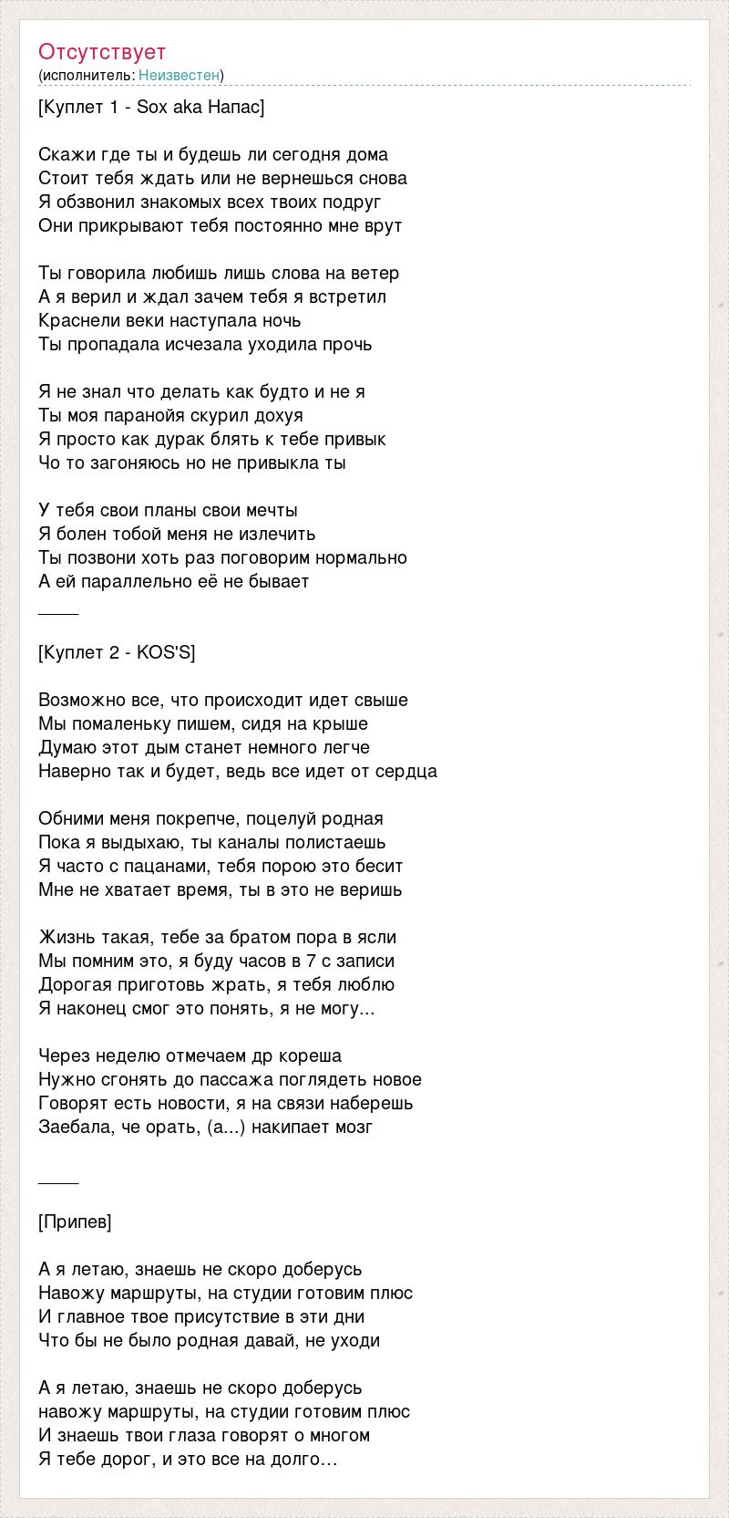 [Куплет 1 - Sox aka Напас] Скажи где ты и будешь ли сегодня дома Стоит тебя ждать или не вернешься снова Я обзвонил знакомых всех твоих подруг Они прикрывают тебя постоянно мне врут Ты говорила любишь лишь слова на ветер А я верил и ждал зачем тебя я встретил Краснели веки наступала ночь Ты пропадала исчезала уходила прочь Я не знал что делать как будто и не я Ты моя паранойя скурил дохуя Я просто как дурак блять к тебе привык Чо то загоняюсь но не привыкла ты У тебя свои планы свои мечты Я болен тобой меня не излечить Ты позвони хоть раз поговорим нормально А ей параллельно её не бывает ____ [Куплет 2 - KOS'S] Возможно все, что происходит идет свыше Мы помаленьку пишем, сидя на крыше Думаю этот дым станет немного легче Наверно так и будет, ведь все идет от сердца Обними меня покрепче, поцелуй родная Пока я выдыхаю, ты каналы полистаешь Я часто с пацанами, тебя порою это бесит Мне не хватает время, ты в это не веришь Жизнь такая, тебе за братом пора в ясли Мы помним это, я буду часов в 7 с записи Дорогая приготовь жрать, я тебя люблю Я наконец смог это понять, я не могу... Через неделю отмечаем др кореша Нужно сгонять до пассажа поглядеть новое Говорят есть новости, я на связи наберешь Заебала, че орать, (а...) накипает мозг ____ [Припев] А я летаю, знаешь не скоро доберусь Навожу маршруты, на студии готовим плюс И главное твое присутствие в эти дни Что бы не было родная давай, не уходи А я летаю, знаешь не скоро доберусь навожу маршруты, на студии готовим плюс И знаешь твои глаза говорят о многом Я тебе дорог, и это все на долго…