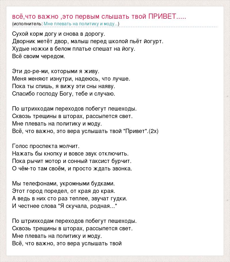 Сухой корм догу и снова в дорогу. Дворник метёт двор, малыш перед школой пьёт йогурт. Худые ножки в белом платье спешат на йогу. Всё своим чередом. Эти до-ре-ми, которыми я живу. Меня меняют изнутри, надеюсь, что лучше. Пока ты спишь, я вижу эти сны наяву. Спасибо господу Богу, тебе и случаю. По штрихкодам переходов побегут пешеходы. Сквозь трещины в шторах, рассыпется свет. Мне плевать на политику и моду. Всё, что важно, это вера услышать твой "Привет".(2х) Голос проспекта молчит. Нажать бы кнопку и вовсе звук отключить. Пока рычит мотор и сонный таксист бурчит. О чём-то там своём, и просто ждать звонка. Мы телефонами, укромными будками. Этот город поредел, от края до края. А ведь в них сто раз теплее, звучат гудки. И честнее слова "Я скучала, родная..." По штрихкодам переходов побегут пешеходы. Сквозь трещины в шторах, рассыпется свет. Мне плевать на политику и моду. Всё, что важно, это вера услышать твой