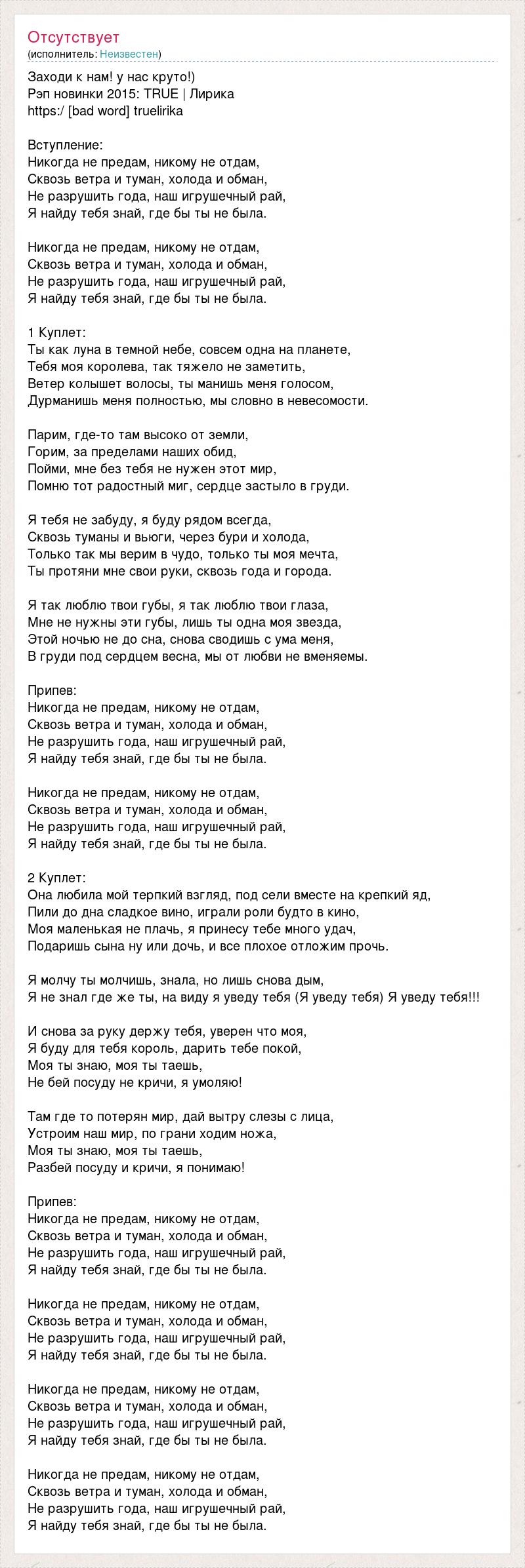 Заходи к нам! у нас круто!) Рэп новинки 2015: TRUE | Лирика https:/ [bad word] truelirika Вступление: Никогда не предам, никому не отдам, Сквозь ветра и туман, холода и обман, Не разрушить года, наш игрушечный рай, Я найду тебя знай, где бы ты не была. Никогда не предам, никому не отдам, Сквозь ветра и туман, холода и обман, Не разрушить года, наш игрушечный рай, Я найду тебя знай, где бы ты не была. 1 Куплет: Ты как луна в темной небе, совсем одна на планете, Тебя моя королева, так тяжело не заметить, Ветер колышет волосы, ты манишь меня голосом, Дурманишь меня полностью, мы словно в невесомости. Парим, где-то там высоко от земли, Горим, за пределами наших обид, Пойми, мне без тебя не нужен этот мир, Помню тот радостный миг, сердце застыло в груди. Я тебя не забуду, я буду рядом всегда, Сквозь туманы и вьюги, через бури и холода, Только так мы верим в чудо, только ты моя мечта, Ты протяни мне свои руки, сквозь года и города. Я так люблю твои губы, я так люблю твои глаза, Мне не нужны эти губы, лишь ты одна моя звезда, Этой ночью не до сна, снова сводишь с ума меня, В груди под сердцем весна, мы от любви не вменяемы. Припев: Никогда не предам, никому не отдам, Сквозь ветра и туман, холода и обман, Не разрушить года, наш игрушечный рай, Я найду тебя знай, где бы ты не была. Никогда не предам, никому не отдам, Сквозь ветра и туман, холода и обман, Не разрушить года, наш игрушечный рай, Я найду тебя знай, где бы ты не была. 2 Куплет: Она любила мой терпкий взгляд, под сели вместе на крепкий яд, Пили до дна сладкое вино, играли роли будто в кино, Моя маленькая не плачь, я принесу тебе много удач, Подаришь сына ну или дочь, и все плохое отложим прочь. Я молчу ты молчишь, знала, но лишь снова дым, Я не знал где же ты, на виду я уведу тебя (Я уведу тебя) Я уведу тебя!!! И снова за руку держу тебя, уверен что моя, Я буду для тебя король, дарить тебе покой, Моя ты знаю, моя ты таешь, Не бей посуду не кричи, я умоляю! Там где то потерян мир, дай вытру слезы с лица, Устроим наш мир, по грани ходим ножа, Моя ты знаю, моя ты таешь, Разбей посуду и кричи, я понимаю! Припев: Никогда не предам, никому не отдам, Сквозь ветра и туман, холода и обман, Не разрушить года, наш игрушечный рай, Я найду тебя знай, где бы ты не была. Никогда не предам, никому не отдам, Сквозь ветра и туман, холода и обман, Не разрушить года, наш игрушечный рай, Я найду тебя знай, где бы ты не была. Никогда не предам, никому не отдам, Сквозь ветра и туман, холода и обман, Не разрушить года, наш игрушечный рай, Я найду тебя знай, где бы ты не была. Никогда не предам, никому не отдам, Сквозь ветра и туман, холода и обман, Не разрушить года, наш игрушечный рай, Я найду тебя знай, где бы ты не была.