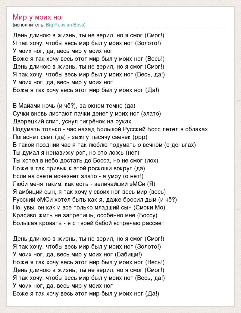 День длиною в жизнь, ты не верил, но я смог (Смог!) Я так хочу, чтобы весь мир был у моих ног (Золото!) У моих ног, да, весь мир у моих ног Боже я так хочу весь этот мир был у моих ног (Весь!) День длиною в жизнь, ты не верил, но я смог (Смог!) Я так хочу, чтобы весь мир был у моих ног (Весь, да!) У моих ног, да, весь мир у моих ног Боже я так хочу весь этот мир был у моих ног (Да!) В Майами ночь (и чё?), за окном темно (да) Сучки вновь листают пачки денег у моих ног (злато) Дворецкий спит, уснул тигрёнок на руках Подумать только - час назад Большой Русский Босс летел в облаках Погаснет свет (да) - зажгу тысячу свечек (ррр) В такой поздний час я так люблю подумать о вечном (о деньгах) Ты думал я ненавижу рэп, но это ложь (нет) Ты хотел в небо достать до Босса, но не смог (лох) Боже я так привык к этой роскоши вокруг (да) Если на свете исчезнет злато - я умру (о нет!) Люби меня таким, как есть - величайший эМСи (Я) Я амбиций сын, я так хочу у своих ног весь мир (весь) Русский эМСи хотел быть как я, даже бросил дым (и чё?) Но, увы, он как и все только младший сын (Смоки Мо) Красиво жить не запретишь, особенно мне (Боссу) Большая кровать - я с твоей бабой встречаю рассвет День длиною в жизнь, ты не верил, но я смог (Смог!) Я так хочу, чтобы весь мир был у моих ног (Золото!) У моих ног, да, весь мир у моих ног (Бабищи!) Боже я так хочу весь этот мир был у моих ног (Весь!) День длиною в жизнь, ты не верил, но я смог (Смог!) Я так хочу, чтобы весь мир был у моих ног (Весь, да!) У моих ног, да, весь мир у моих ног Боже я так хочу весь этот мир был у моих ног (Да!)