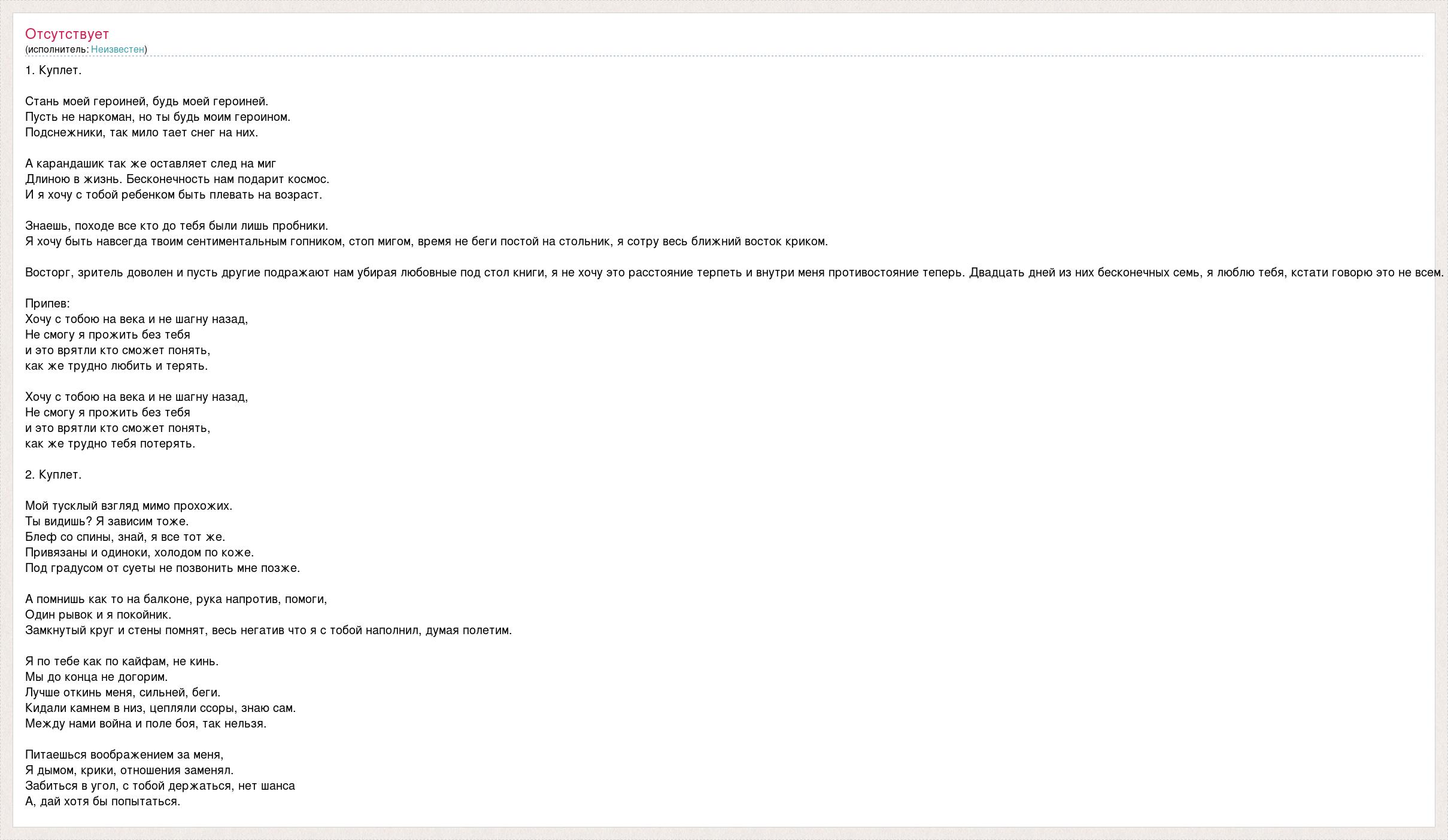 1. Куплет. Стань моей героиней, будь моей героиней. Пусть не наркоман, но ты будь моим героином. Подснежники, так мило тает снег на них. А карандашик так же оставляет след на миг Длиною в жизнь. Бесконечность нам подарит космос. И я хочу с тобой ребенком быть плевать на возраст. Знаешь, походе все кто до тебя были лишь пробники. Я хочу быть навсегда твоим сентиментальным гопником, стоп мигом, время не беги постой на стольник, я сотру весь ближний восток криком. Восторг, зритель доволен и пусть другие подражают нам убирая любовные под стол книги, я не хочу это расстояние терпеть и внутри меня противостояние теперь. Двадцать дней из них бесконечных семь, я люблю тебя, кстати говорю это не всем. Припев: Хочу с тобою на века и не шагну назад, Не смогу я прожить без тебя и это врятли кто сможет понять, как же трудно любить и терять. Хочу с тобою на века и не шагну назад, Не смогу я прожить без тебя и это врятли кто сможет понять, как же трудно тебя потерять. 2. Куплет. Мой тусклый взгляд мимо прохожих. Ты видишь? Я зависим тоже. Блеф со спины, знай, я все тот же. Привязаны и одиноки, холодом по коже. Под градусом от суеты не позвонить мне позже. А помнишь как то на балконе, рука напротив, помоги, Один рывок и я покойник. Замкнутый круг и стены помнят, весь негатив что я с тобой наполнил, думая полетим. Я по тебе как по кайфам, не кинь. Мы до конца не догорим. Лучше откинь меня, сильней, беги. Кидали камнем в низ, цепляли ссоры, знаю сам. Между нами война и поле боя, так нельзя. Питаешься воображением за меня, Я дымом, крики, отношения заменял. Забиться в угол, с тобой держаться, нет шанса А, дай хотя бы попытаться.