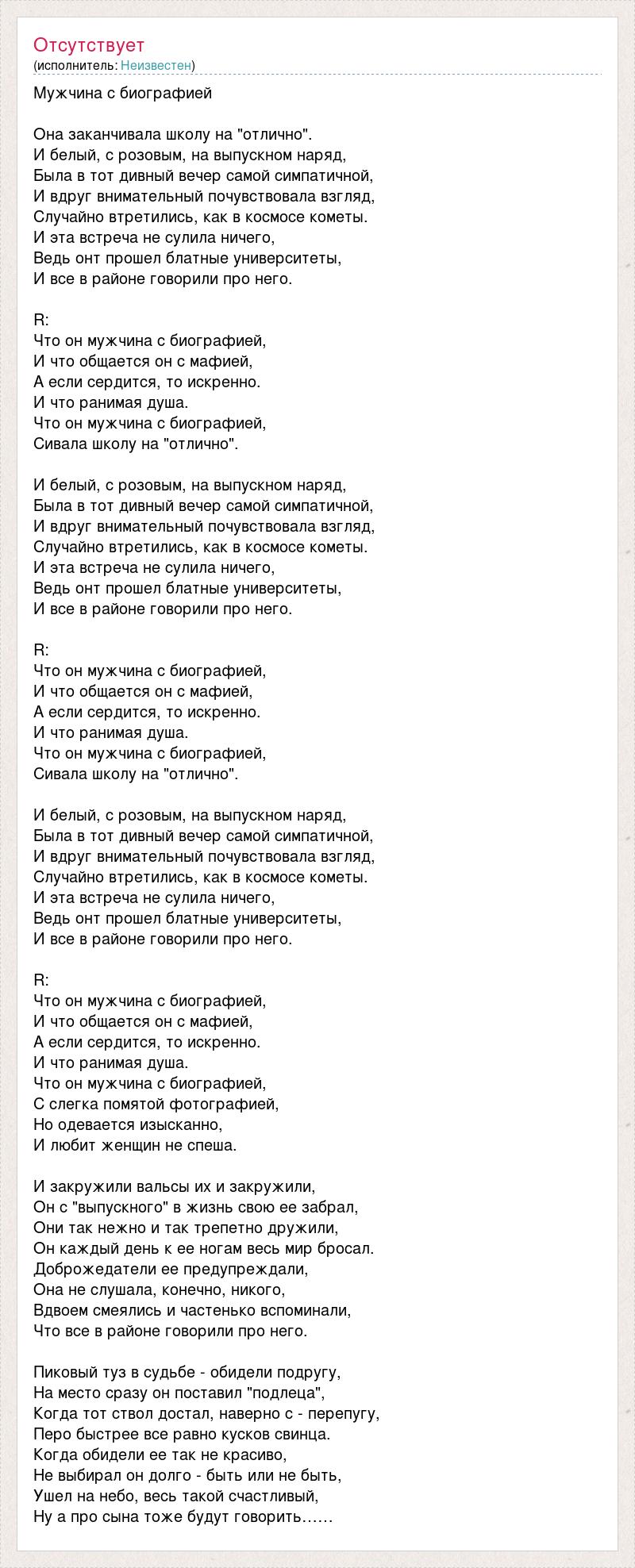 Мужчина с биографией Она заканчивала школу на "отлично". И белый, с розовым, на выпускном наряд, Была в тот дивный вечер самой симпатичной, И вдруг внимательный почувствовала взгляд, Случайно втретились, как в космосе кометы. И эта встреча не сулила ничего, Ведь онт прошел блатные университеты, И все в районе говорили про него. R: Что он мужчина с биографией, И что общается он с мафией, А если сердится, то искренно. И что ранимая душа. Что он мужчина с биографией, Сивала школу на "отлично". И белый, с розовым, на выпускном наряд, Была в тот дивный вечер самой симпатичной, И вдруг внимательный почувствовала взгляд, Случайно втретились, как в космосе кометы. И эта встреча не сулила ничего, Ведь онт прошел блатные университеты, И все в районе говорили про него. R: Что он мужчина с биографией, И что общается он с мафией, А если сердится, то искренно. И что ранимая душа. Что он мужчина с биографией, Сивала школу на "отлично". И белый, с розовым, на выпускном наряд, Была в тот дивный вечер самой симпатичной, И вдруг внимательный почувствовала взгляд, Случайно втретились, как в космосе кометы. И эта встреча не сулила ничего, Ведь онт прошел блатные университеты, И все в районе говорили про него. R: Что он мужчина с биографией, И что общается он с мафией, А если сердится, то искренно. И что ранимая душа. Что он мужчина с биографией, С слегка помятой фотографией, Но одевается изысканно, И любит женщин не спеша. И закружили вальсы их и закружили, Он с "выпускного" в жизнь свою ее забрал, Они так нежно и так трепетно дружили, Он каждый день к ее ногам весь мир бросал. Доброжедатели ее предупреждали, Она не слушала, конечно, никого, Вдвоем смеялись и частенько вспоминали, Что все в районе говорили про него. Пиковый туз в судьбе - обидели подругу, На место сразу он поставил "подлеца", Когда тот ствол достал, наверно с - перепугу, Перо быстрее все равно кусков свинца. Когда обидели ее так не красиво, Не выбирал он долго - быть или не быть, Ушел на небо, весь такой счастливый, Ну а про сына тоже будут говорить……
