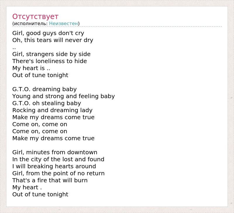 Girl, good guys don't cry Oh, this tears will never dry .. Girl, strangers side by side There's loneliness to hide My heart is .. Out of tune tonight G.T.O. dreaming baby Young and strong and feeling baby G.T.O. oh stealing baby Rocking and dreaming lady Make my dreams come true Come on, come on Come on, come on Make my dreams come true Girl, minutes from downtown In the city of the lost and found I will breaking hearts around Girl, from the point of no return That's a fire that will burn My heart . Out of tune tonight