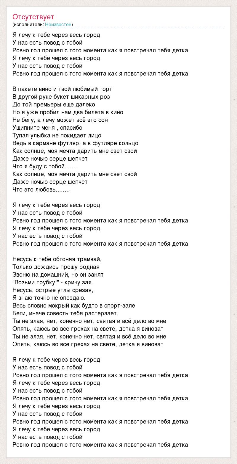 Я лечу к тебе через весь город У нас есть повод с тобой Ровно год прошел с того момента как я повстречал тебя детка Я лечу к тебе через весь город У нас есть повод с тобой Ровно год прошел с того момента как я повстречал тебя детка В пакете вино и твой любимый торт В другой руке букет шикарных роз До той премьеры еще далеко Но я уже пробил нам два билета в кино Не бегу, а лечу может всё это сон Ущипните меня , спасибо Тупая улыбка не покидает лицо Ведь в кармане футляр, а в футляре кольцо Как солнце, моя мечта дарить мне свет свой Даже ночью серце шепчет Что я буду с тобой........ Как солнце, моя мечта дарить мне свет свой Даже ночью серце шепчет Что это любовь........ Я лечу к тебе через весь город У нас есть повод с тобой Ровно год прошел с того момента как я повстречал тебя детка Я лечу к тебе через весь город У нас есть повод с тобой Ровно год прошел с того момента как я повстречал тебя детка Несусь к тебе обгоняя трамвай, Только дождись прошу родная Звоню на домашний, но он занят "Возьми трубку!" - кричу зая. Несусь, острые углы срезая, Я знаю точно не опоздаю. Весь словно мокрый как будто в спорт-зале Беги, иначе совесть тебя растерзает. Ты не злая, нет, конечно нет, святая и всё дело во мне Опять, каюсь во все грехах на свете, детка я виноват Ты не злая, нет, конечно нет, святая и всё дело во мне Опять, каюсь во все грехах на свете, детка я виноват Я лечу к тебе через весь город У нас есть повод с тобой Ровно год прошел с того момента как я повстречал тебя детка Я лечу к тебе через весь город У нас есть повод с тобой Ровно год прошел с того момента как я повстречал тебя детка Я лечу к тебе через весь город У нас есть повод с тобой Ровно год прошел с того момента как я повстречал тебя детка Я лечу к тебе через весь город У нас есть повод с тобой Ровно год прошел с того момента как я повстречал тебя детка