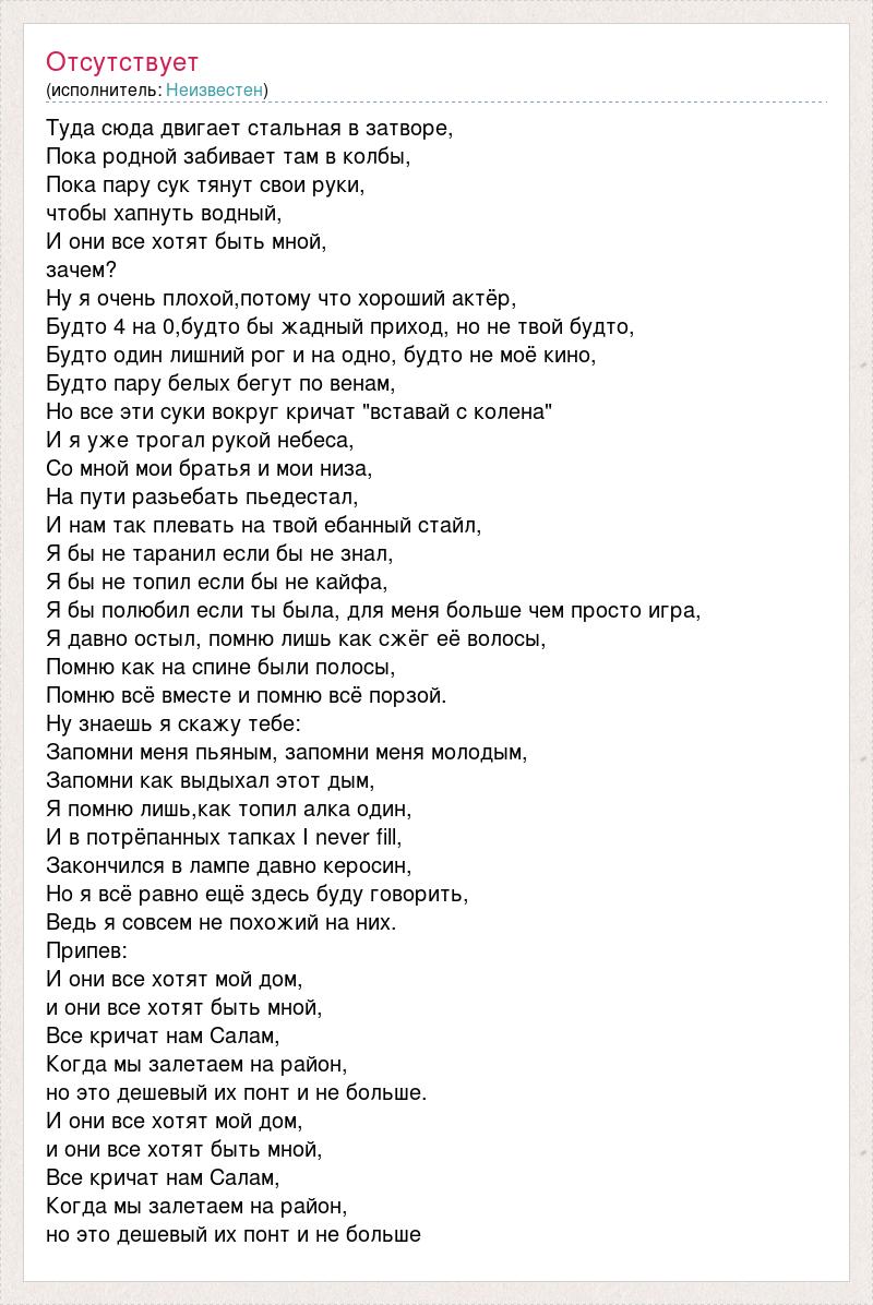 Туда сюда двигает стальная в затворе, Пока родной забивает там в колбы, Пока пару сук тянут свои руки, чтобы хапнуть водный, И они все хотят быть мной, зачем? Ну я очень плохой,потому что хороший актёр, Будто 4 на 0,будто бы жадный приход, но не твой будто, Будто один лишний рог и на одно, будто не моё кино, Будто пару белых бегут по венам, Но все эти суки вокруг кричат "вставай с колена" И я уже трогал рукой небеса, Со мной мои братья и мои низа, На пути разьебать пьедестал, И нам так плевать на твой ебанный стайл, Я бы не таранил если бы не знал, Я бы не топил если бы не кайфа, Я бы полюбил если ты была, для меня больше чем просто игра, Я давно остыл, помню лишь как сжёг её волосы, Помню как на спине были полосы, Помню всё вместе и помню всё порзой. Ну знаешь я скажу тебе: Запомни меня пьяным, запомни меня молодым, Запомни как выдыхал этот дым, Я помню лишь,как топил алка один, И в потрёпанных тапках I never fill, Закончился в лампе давно керосин, Но я всё равно ещё здесь буду говорить, Ведь я совсем не похожий на них. Припев: И они все хотят мой дом, и они все хотят быть мной, Все кричат нам Салам, Когда мы залетаем на район, но это дешевый их понт и не больше. И они все хотят мой дом, и они все хотят быть мной, Все кричат нам Салам, Когда мы залетаем на район, но это дешевый их понт и не больше