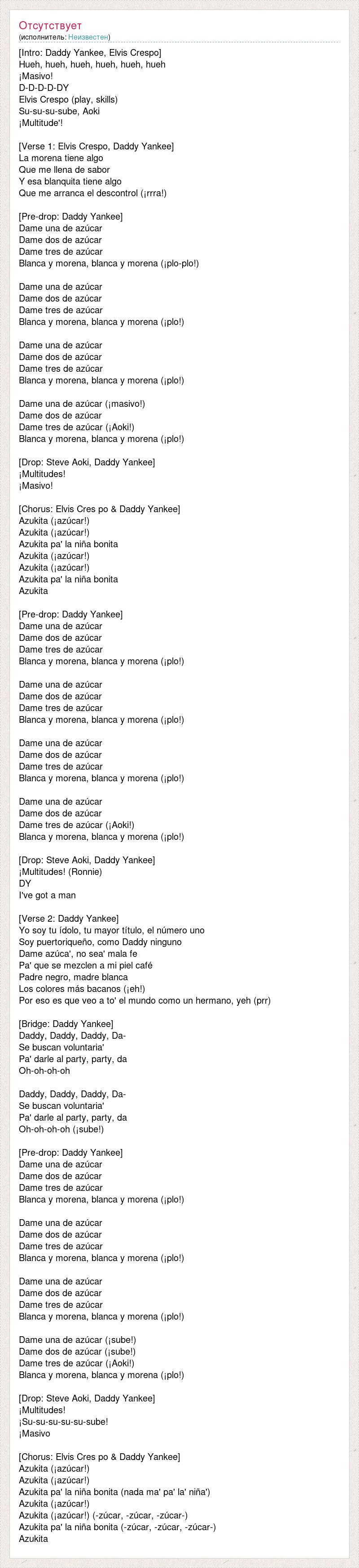 [Intro: Daddy Yankee, Elvis Crespo] Hueh, hueh, hueh, hueh, hueh, hueh ¡Masivo! D-D-D-D-DY Elvis Crespo (play, skills) Su-su-su-sube, Aoki ¡Multitude'! [Verse 1: Elvis Crespo, Daddy Yankee] La morena tiene algo Que me llena de sabor Y esa blanquita tiene algo Que me arranca el descontrol (¡rrra!) [Pre-drop: Daddy Yankee] Dame una de azúcar Dame dos de azúcar Dame tres de azúcar Blanca y morena, blanca y morena (¡plo-plo!) Dame una de azúcar Dame dos de azúcar Dame tres de azúcar Blanca y morena, blanca y morena (¡plo!) Dame una de azúcar Dame dos de azúcar Dame tres de azúcar Blanca y morena, blanca y morena (¡plo!) Dame una de azúcar (¡masivo!) Dame dos de azúcar Dame tres de azúcar (¡Aoki!) Blanca y morena, blanca y morena (¡plo!) [Drop: Steve Aoki, Daddy Yankee] ¡Multitudes! ¡Masivo! [Chorus: Elvis Cres po & Daddy Yankee] Azukita (¡azúcar!) Azukita (¡azúcar!) Azukita pa' la niña bonita Azukita (¡azúcar!) Azukita (¡azúcar!) Azukita pa' la niña bonita Azukita [Pre-drop: Daddy Yankee] Dame una de azúcar Dame dos de azúcar Dame tres de azúcar Blanca y morena, blanca y morena (¡plo!) Dame una de azúcar Dame dos de azúcar Dame tres de azúcar Blanca y morena, blanca y morena (¡plo!) Dame una de azúcar Dame dos de azúcar Dame tres de azúcar Blanca y morena, blanca y morena (¡plo!) Dame una de azúcar Dame dos de azúcar Dame tres de azúcar (¡Aoki!) Blanca y morena, blanca y morena (¡plo!) [Drop: Steve Aoki, Daddy Yankee] ¡Multitudes! (Ronnie) DY I've got a man [Verse 2: Daddy Yankee] Yo soy tu ídolo, tu mayor título, el número uno Soy puertoriqueño, como Daddy ninguno Dame azúca', no sea' mala fe Pa' que se mezclen a mi piel café Padre negro, madre blanca Los colores más bacanos (¡eh!) Por eso es que veo a to' el mundo como un hermano, yeh (prr) [Bridge: Daddy Yankee] Daddy, Daddy, Daddy, Da- Se buscan voluntaria' Pa' darle al party, party, da Oh-oh-oh-oh Daddy, Daddy, Daddy, Da- Se buscan voluntaria' Pa' darle al party, party, da Oh-oh-oh-oh (¡sube!) [Pre-drop: Daddy Yankee] Dame una de azúcar Dame dos de azúcar Dame tres de azúcar Blanca y morena, blanca y morena (¡plo!) Dame una de azúcar Dame dos de azúcar Dame tres de azúcar Blanca y morena, blanca y morena (¡plo!) Dame una de azúcar Dame dos de azúcar Dame tres de azúcar Blanca y morena, blanca y morena (¡plo!) Dame una de azúcar (¡sube!) Dame dos de azúcar (¡sube!) Dame tres de azúcar (¡Aoki!) Blanca y morena, blanca y morena (¡plo!) [Drop: Steve Aoki, Daddy Yankee] ¡Multitudes! ¡Su-su-su-su-su-sube! ¡Masivo [Chorus: Elvis Cres po & Daddy Yankee] Azukita (¡azúcar!) Azukita (¡azúcar!) Azukita pa' la niña bonita (nada ma' pa' la' niña') Azukita (¡azúcar!) Azukita (¡azúcar!) (-zúcar, -zúcar, -zúcar-) Azukita pa' la niña bonita (-zúcar, -zúcar, -zúcar-) Azukita