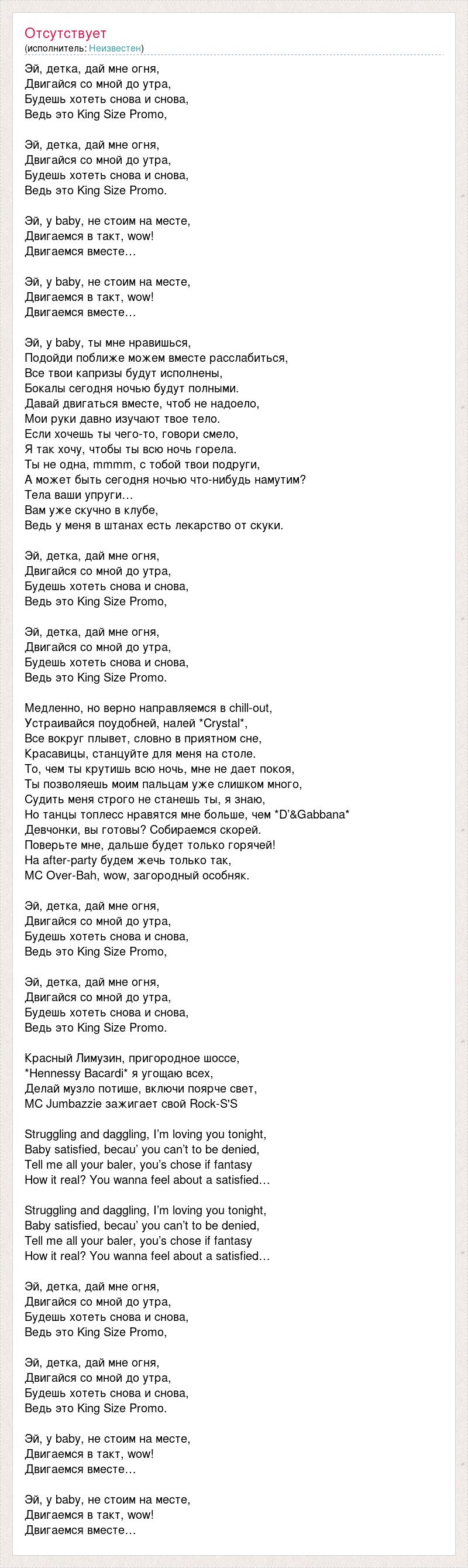 Эй, детка, дай мне огня, Двигайся со мной до утра, Будешь хотеть снова и снова, Ведь это King Size Promo, Эй, детка, дай мне огня, Двигайся со мной до утра, Будешь хотеть снова и снова, Ведь это King Size Promo. Эй, y baby, не стоим на месте, Двигаемся в такт, wow! Двигаемся вместе… Эй, y baby, не стоим на месте, Двигаемся в такт, wow! Двигаемся вместе… Эй, y baby, ты мне нравишься, Подойди поближе можем вместе расслабиться, Все твои капризы будут исполнены, Бокалы сегодня ночью будут полными. Давай двигаться вместе, чтоб не надоело, Мои руки давно изучают твое тело. Если хочешь ты чего-то, говори смело, Я так хочу, чтобы ты всю ночь горела. Ты не одна, mmmm, с тобой твои подруги, А может быть сегодня ночью что-нибудь намутим? Тела ваши упруги… Вам уже скучно в клубе, Ведь у меня в штанах есть лекарство от скуки. Эй, детка, дай мне огня, Двигайся со мной до утра, Будешь хотеть снова и снова, Ведь это King Size Promo, Эй, детка, дай мне огня, Двигайся со мной до утра, Будешь хотеть снова и снова, Ведь это King Size Promo. Медленно, но верно направляемся в chill-out, Устраивайся поудобней, налей *Crystal*, Все вокруг плывет, словно в приятном сне, Красавицы, станцуйте для меня на столе. То, чем ты крутишь всю ночь, мне не дает покоя, Ты позволяешь моим пальцам уже слишком много, Судить меня строго не станешь ты, я знаю, Но танцы топлесс нравятся мне больше, чем *D’&Gabbana* Девчонки, вы готовы? Собираемся скорей. Поверьте мне, дальше будет только горячей! На after-party будем жечь только так, MC Over-Bah, wow, загородный особняк. Эй, детка, дай мне огня, Двигайся со мной до утра, Будешь хотеть снова и снова, Ведь это King Size Promo, Эй, детка, дай мне огня, Двигайся со мной до утра, Будешь хотеть снова и снова, Ведь это King Size Promo. Красный Лимузин, пригородное шоссе, *Hennessy Bacardi* я угощаю всех, Делай музло потише, включи поярче свет, MC Jumbazzie зажигает свой Rock-S'S Struggling and daggling, I’m loving you tonight, Baby satisfied, becau’ you can’t to be denied, Tell me all your baler, you’s chose if fantasy How it real? You wanna feel about a satisfied… Struggling and daggling, I’m loving you tonight, Baby satisfied, becau’ you can’t to be denied, Tell me all your baler, you’s chose if fantasy How it real? You wanna feel about a satisfied… Эй, детка, дай мне огня, Двигайся со мной до утра, Будешь хотеть снова и снова, Ведь это King Size Promo, Эй, детка, дай мне огня, Двигайся со мной до утра, Будешь хотеть снова и снова, Ведь это King Size Promo. Эй, y baby, не стоим на месте, Двигаемся в такт, wow! Двигаемся вместе… Эй, y baby, не стоим на месте, Двигаемся в такт, wow! Двигаемся вместе…