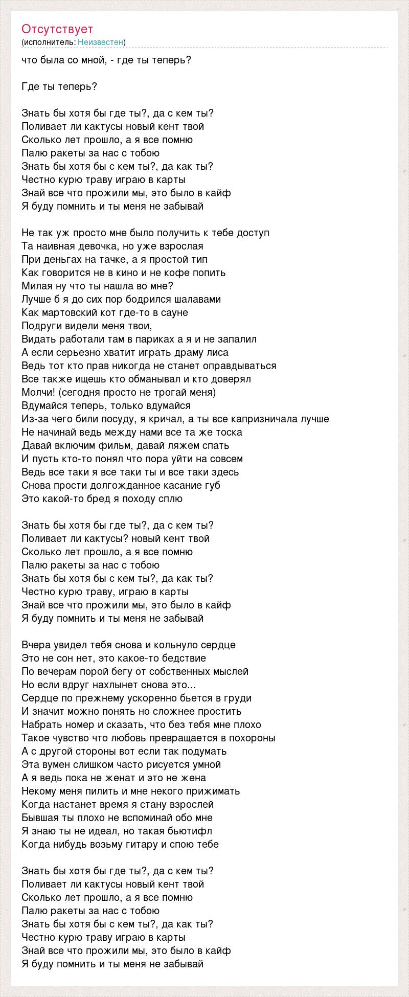 что была со мной, - где ты теперь? Где ты теперь? Знать бы хотя бы где ты?, да с кем ты? Поливает ли кактусы новый кент твой Сколько лет прошло, а я все помню Палю ракеты за нас с тобою Знать бы хотя бы с кем ты?, да как ты? Честно курю траву играю в карты Знай все что прожили мы, это было в кайф Я буду помнить и ты меня не забывай Не так уж просто мне было получить к тебе доступ Та наивная девочка, но уже взрослая При деньгах на тачке, а я простой тип Как говорится не в кино и не кофе попить Милая ну что ты нашла во мне? Лучше б я до сих пор бодрился шалавами Как мартовский кот где-то в сауне Подруги видели меня твои, Видать работали там в париках а я и не запалил А если серьезно хватит играть драму лиса Ведь тот кто прав никогда не станет оправдываться Все также ищешь кто обманывал и кто доверял Молчи! (сегодня просто не трогай меня) Вдумайся теперь, только вдумайся Из-за чего били посуду, я кричал, а ты все капризничала лучше Не начинай ведь между нами все та же тоска Давай включим фильм, давай ляжем спать И пусть кто-то понял что пора уйти на совсем Ведь все таки я все таки ты и все таки здесь Снова прости долгожданное касание губ Это какой-то бред я походу сплю Знать бы хотя бы где ты?, да с кем ты? Поливает ли кактусы? новый кент твой Сколько лет прошло, а я все помню Палю ракеты за нас с тобою Знать бы хотя бы с кем ты?, да как ты? Честно курю траву, играю в карты Знай все что прожили мы, это было в кайф Я буду помнить и ты меня не забывай Вчера увидел тебя снова и кольнуло сердце Это не сон нет, это какое-то бедствие По вечерам порой бегу от собственных мыслей Но если вдруг нахлынет снова это... Сердце по прежнему ускоренно бьется в груди И значит можно понять но сложнее простить Набрать номер и сказать, что без тебя мне плохо Такое чувство что любовь превращается в похороны А с другой стороны вот если так подумать Эта вумен слишком часто рисуется умной А я ведь пока не женат и это не жена Некому меня пилить и мне некого прижимать Когда настанет время я стану взрослей Бывшая ты плохо не вспоминай обо мне Я знаю ты не идеал, но такая бьютифл Когда нибудь возьму гитару и спою тебе Знать бы хотя бы где ты?, да с кем ты? Поливает ли кактусы новый кент твой Сколько лет прошло, а я все помню Палю ракеты за нас с тобою Знать бы хотя бы с кем ты?, да как ты? Честно курю траву играю в карты Знай все что прожили мы, это было в кайф Я буду помнить и ты меня не забывай