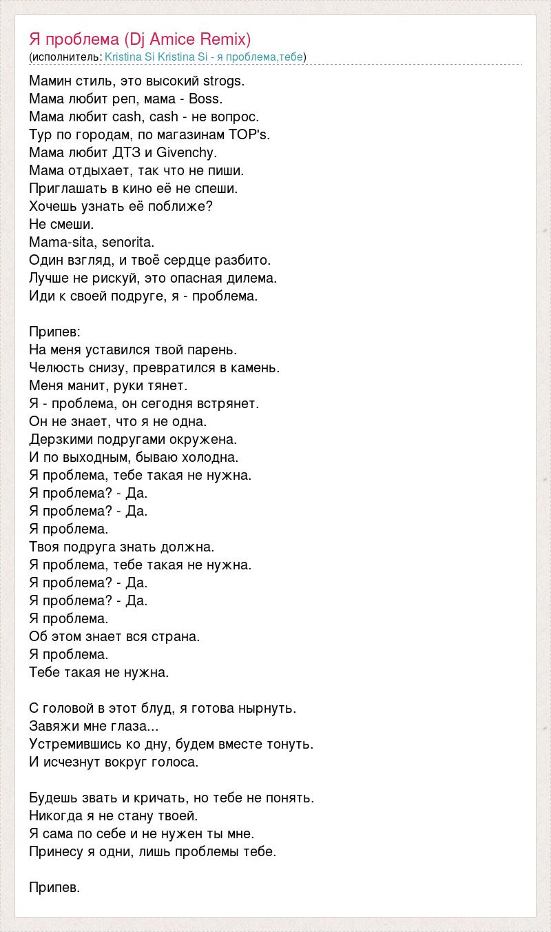 Мамин стиль, это высокий strogs. Мама любит реп, мама - Boss. Мама любит cash, cash - не вопрос. Тур по городам, по магазинам TOP's. Мама любит ДТЗ и Givenchy. Мама отдыхает, так что не пиши. Приглашать в кино её не спеши. Хочешь узнать её поближе? Не смеши. Mama-sita, senorita. Один взгляд, и твоё сердце разбито. Лучше не рискуй, это опасная дилема. Иди к своей подруге, я - проблема. Припев: На меня уставился твой парень. Челюсть снизу, превратился в камень. Меня манит, руки тянет. Я - проблема, он сегодня встрянет. Он не знает, что я не одна. Дерзкими подругами окружена. И по выходным, бываю холодна. Я проблема, тебе такая не нужна. Я проблема? - Да. Я проблема? - Да. Я проблема. Твоя подруга знать должна. Я проблема, тебе такая не нужна. Я проблема? - Да. Я проблема? - Да. Я проблема. Об этом знает вся страна. Я проблема. Тебе такая не нужна. С головой в этот блуд, я готова нырнуть. Завяжи мне глаза... Устремившись ко дну, будем вместе тонуть. И исчезнут вокруг голоса. Будешь звать и кричать, но тебе не понять. Никогда я не стану твоей. Я сама по себе и не нужен ты мне. Принесу я одни, лишь проблемы тебе. Припев.