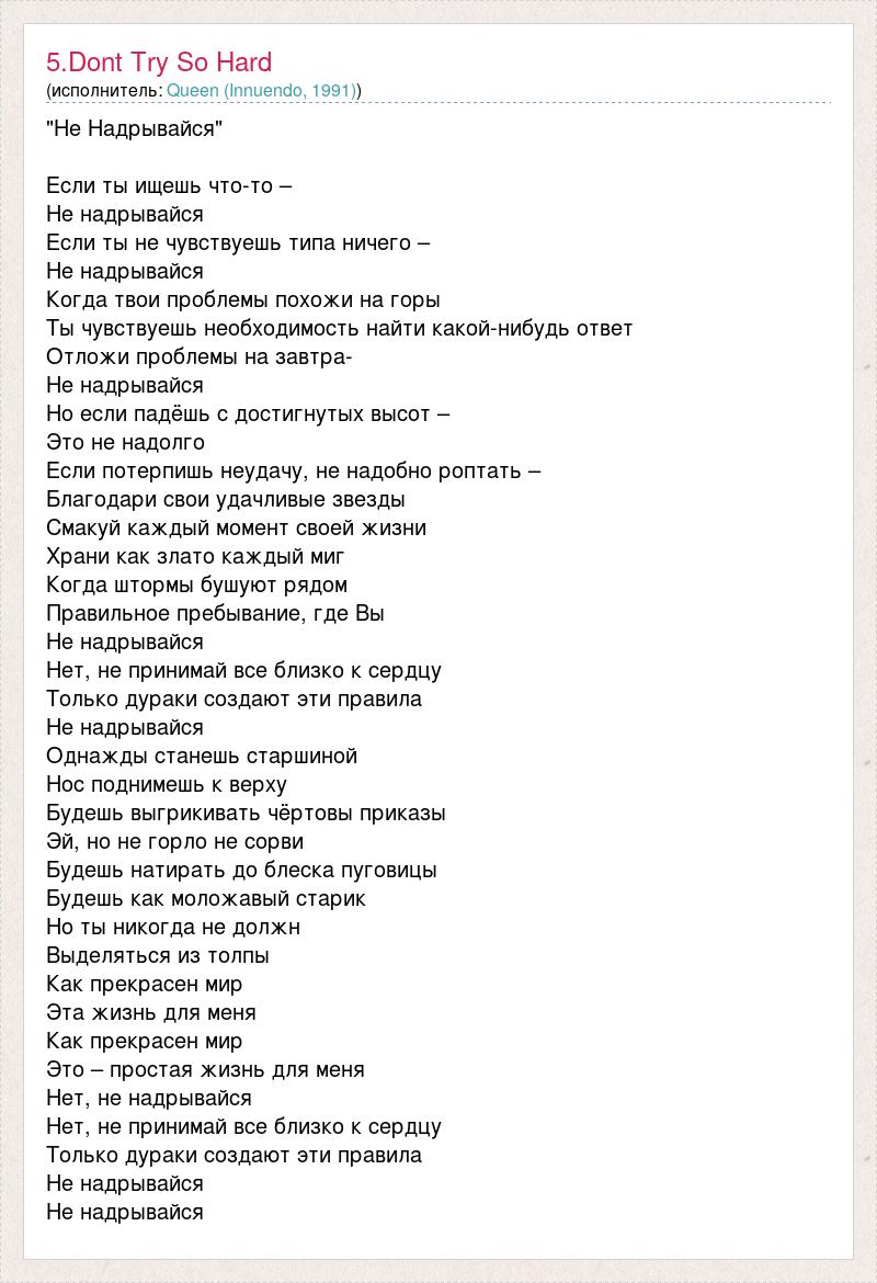 "Не Надрывайся" Если ты ищешь что-то – Не надрывайся Если ты не чувствуешь типа ничего – Не надрывайся Когда твои проблемы похожи на горы Ты чувствуешь необходимость найти какой-нибудь ответ Отложи проблемы на завтра- Не надрывайся Но если падёшь с достигнутых высот – Это не надолго Если потерпишь неудачу, не надобно роптать – Благодари свои удачливые звезды Смакуй каждый момент своей жизни Храни как злато каждый миг Когда штормы бушуют рядом Правильное пребывание, где Вы Не надрывайся Нет, не принимай все близко к сердцу Только дураки создают эти правила Не надрывайся Однажды станешь старшиной Нос поднимешь к верху Будешь выгрикивать чёртовы приказы Эй, но не горло не сорви Будешь натирать до блеска пуговицы Будешь как моложавый старик Но ты никогда не должн Выделяться из толпы Как прекрасен мир Эта жизнь для меня Как прекрасен мир Это – простая жизнь для меня Нет, не надрывайся Нет, не принимай все близко к сердцу Только дураки создают эти правила Не надрывайся Не надрывайся