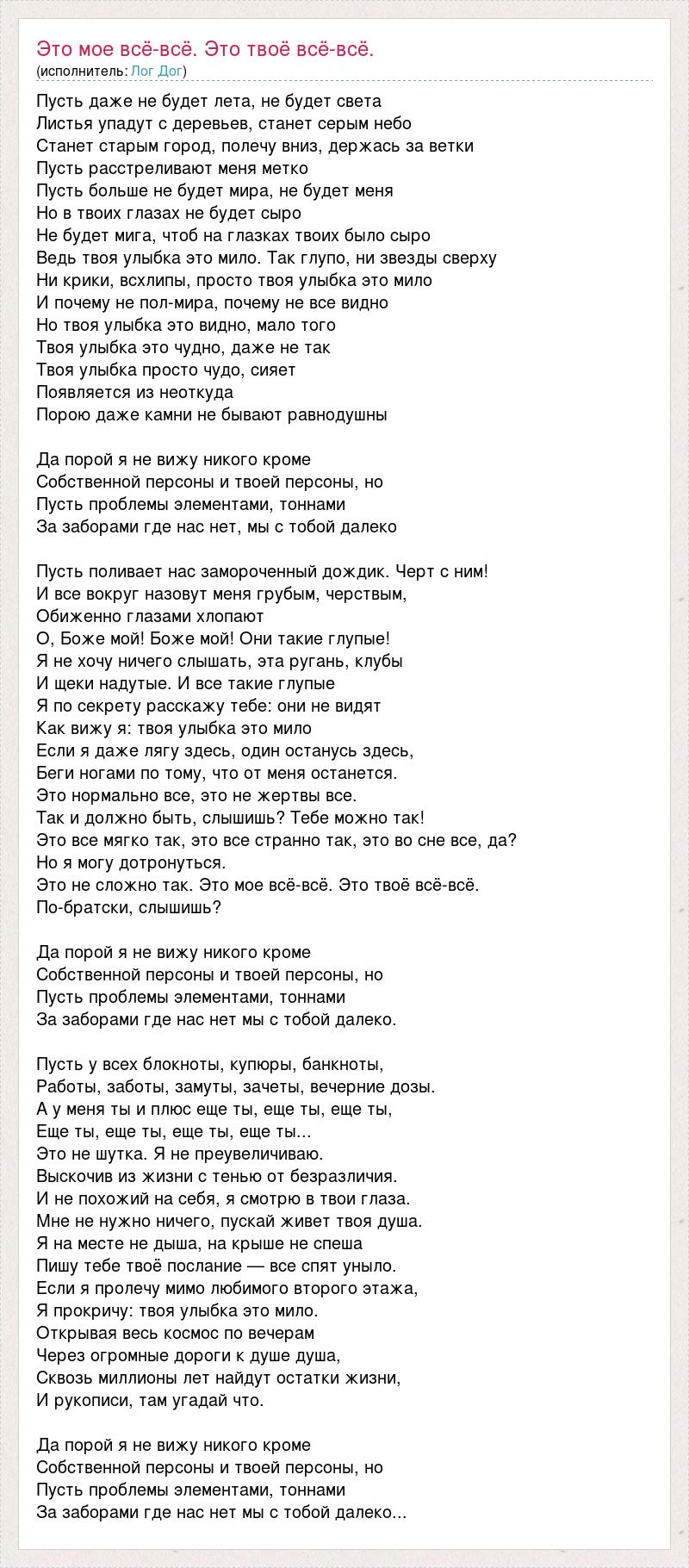 Пусть даже не будет лета, не будет света Листья упадут с деревьев, станет серым небо Станет старым город, полечу вниз, держась за ветки Пусть расстреливают меня метко Пусть больше не будет мира, не будет меня Но в твоих глазах не будет сыро Не будет мига, чтоб на глазках твоих было сыро Ведь твоя улыбка это мило. Так глупо, ни звезды сверху Ни крики, всхлипы, просто твоя улыбка это мило И почему не пол-мира, почему не все видно Но твоя улыбка это видно, мало того Твоя улыбка это чудно, даже не так Твоя улыбка просто чудо, сияет Появляется из неоткуда Порою даже камни не бывают равнодушны Да порой я не вижу никого кроме Собственной персоны и твоей персоны, но Пусть проблемы элементами, тоннами За заборами где нас нет, мы с тобой далеко Пусть поливает нас замороченный дождик. Черт с ним! И все вокруг назовут меня грубым, черствым, Обиженно глазами хлопают О, Боже мой! Боже мой! Они такие глупые! Я не хочу ничего слышать, эта ругань, клубы И щеки надутые. И все такие глупые Я по секрету расскажу тебе: они не видят Как вижу я: твоя улыбка это мило Если я даже лягу здесь, один останусь здесь, Беги ногами по тому, что от меня останется. Это нормально все, это не жертвы все. Так и должно быть, слышишь? Тебе можно так! Это все мягко так, это все странно так, это во сне все, да? Но я могу дотронуться. Это не сложно так. Это мое всё-всё. Это твоё всё-всё. По-братски, слышишь? Да порой я не вижу никого кроме Собственной персоны и твоей персоны, но Пусть проблемы элементами, тоннами За заборами где нас нет мы с тобой далеко. Пусть у всех блокноты, купюры, банкноты, Работы, заботы, замуты, зачеты, вечерние дозы. А у меня ты и плюс еще ты, еще ты, еще ты, Еще ты, еще ты, еще ты, еще ты... Это не шутка. Я не преувеличиваю. Выскочив из жизни с тенью от безразличия. И не похожий на себя, я смотрю в твои глаза. Мне не нужно ничего, пускай живет твоя душа. Я на месте не дыша, на крыше не спеша Пишу тебе твоё послание — все спят уныло. Если я пролечу мимо любимого второго этажа, Я прокричу: твоя улыбка это мило. Открывая весь космос по вечерам Через огромные дороги к душе душа, Сквозь миллионы лет найдут остатки жизни, И рукописи, там угадай что. Да порой я не вижу никого кроме Собственной персоны и твоей персоны, но Пусть проблемы элементами, тоннами За заборами где нас нет мы с тобой далеко...