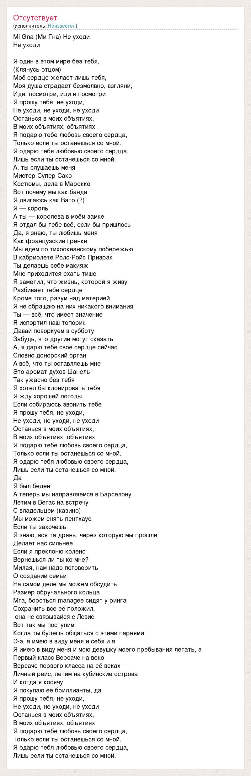 Mi Gna (Ми Гна) Не уходи Не уходи Я один в этом мире без тебя, (Клянусь отцом) Моё сердце желает лишь тебя, Моя душа страдает безмолвно, взгляни, Иди, посмотри, иди и посмотри Я прошу тебя, не уходи, Не уходи, не уходи, не уходи Останься в моих объятиях, В моих объятиях, объятиях Я подарю тебе любовь своего сердца, Только если ты останешься со мной. Я одарю тебя любовью своего сердца, Лишь если ты останешься со мной. А, ты слушаешь меня Мистер Супер Сако Костюмы, дела в Марокко Вот почему мы как банда Я двигаюсь как Вато (?) Я — король А ты — королева в моём замке Я отдал бы тебе всё, если бы пришлось Да, я знаю, ты любишь меня Как французские гренки Мы едем по тихоокеанскому побережью В кабриолете Ролс-Ройс Призрак Ты делаешь себе макияж Мне приходится ехать тише Я заметил, что жизнь, которой я живу Разбивает тебе сердце Кроме того, разум над материей Я не обращаю на них никакого внимания Ты — всё, что имеет значение Я испортил наш топорик Давай поворкуем в субботу Забудь, что другие могут сказать А, я дарю тебе своё сердце сейчас Словно донорский орган А всё, что ты оставляешь мне Это аромат духов Шанель Так ужасно без тебя Я хотел бы клонировать тебя Я жду хорошей погоды Если собираюсь звонить тебе Я прошу тебя, не уходи, Не уходи, не уходи, не уходи Останься в моих объятиях, В моих объятиях, объятиях Я подарю тебе любовь своего сердца, Только если ты останешься со мной. Я одарю тебя любовью своего сердца, Лишь если ты останешься со мной. Да Я был беден А теперь мы направляемся в Барселону Летим в Вегас на встречу С владельцем (казино) Мы можем снять пентхаус Если ты захочешь Я знаю, вся та дрянь, через которую мы прошли Делает нас сильнее Если я преклоню колено Вернешься ли ты ко мне? Милая, нам надо поговорить О создании семьи На самом деле мы можем обсудить Размер обручального кольца Мга, бороться managee сидят у ринга Сохранить все ее положил, она не связывайся с Левис Вот так мы поступим Когда ты будешь общаться с этими парнями Э-э, я имею в виду меня и себя и я Я имею в виду меня и мою девушку моего пребывания летать, э Первый класс Версаче на веко Версаче первого класса на её веках Личный рейс, летим на кубинские острова И когда я косячу Я покупаю её бриллианты, да Я прошу тебя, не уходи, Не уходи, не уходи, не уходи Останься в моих объятиях, В моих объятиях, объятиях Я подарю тебе любовь своего сердца, Только если ты останешься со мной. Я одарю тебя любовью своего сердца, Лишь если ты останешься со мной.