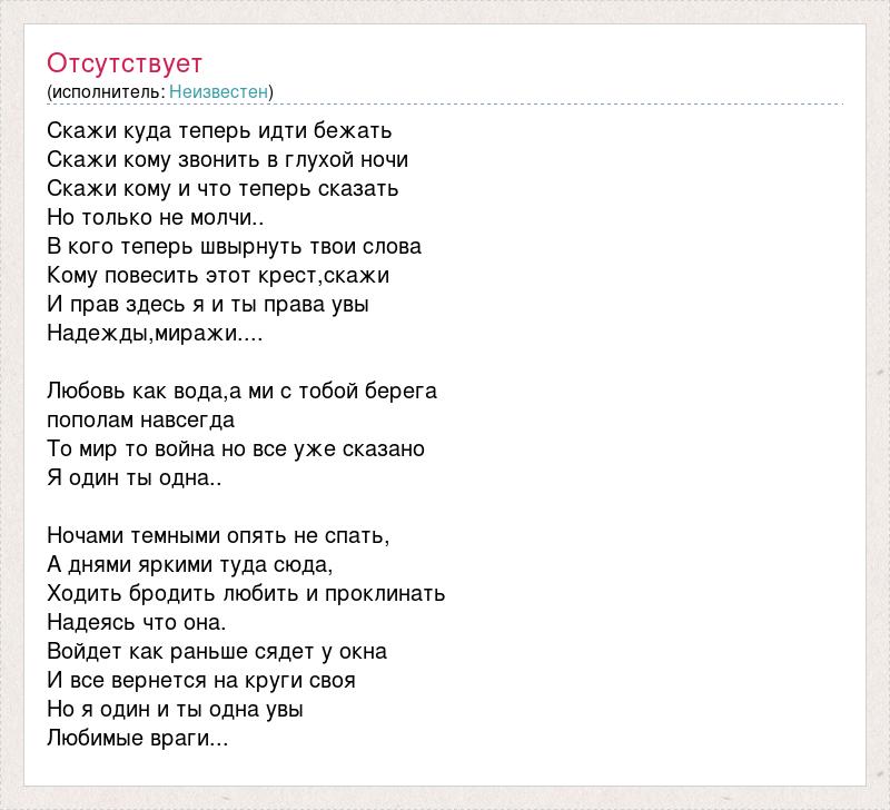 Скажи куда теперь идти бежать Скажи кому звонить в глухой ночи Скажи кому и что теперь сказать Но только не молчи.. В кого теперь швырнуть твои слова Кому повесить этот крест,скажи И прав здесь я и ты права увы Надежды,миражи.... Любовь как вода,а ми с тобой берега пополам навсегда То мир то война но все уже сказано Я один ты одна.. Ночами темными опять не спать, А днями яркими туда сюда, Ходить бродить любить и проклинать Надеясь что она. Войдет как раньше сядет у окна И все вернется на круги своя Но я один и ты одна увы Любимые враги...