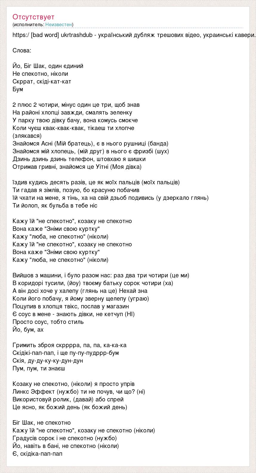 https:/ [bad word] ukrtrashdub - український дубляж трешових відео, украинські кавери. Слова: Йо, Біг Шак, один єдиний Не спекотно, ніколи Скррат, скіді-кат-кат Бум 2 плюс 2 чотири, мінус один це три, щоб знав На районі хлопці завжди, смалять зеленку У парку твою дівку бачу, вона комусь смокче Коли чуєш квак-квак-квак, тікаеш ти хлопче (злякався) Знайомся Асні (Мій братець), є в нього рушниці (банда) Знайомся мій хлопець, (мій друг) в нього є фризбі (шух) Дзинь дзинь дзинь телефон, штовхаю я шишки Отримав гривні, знайомся це Уітні (Моя дівка) їздив кудись десять разів, це як моїх пальців (моїх пальців) Ти гадав я зімлів, позую, бо красуню побачив їй чхати на мене, я тінь, ха на свій дзьоб подивись (у дзеркало глянь) Ти йолоп, як бульба в тебе ніс Кажу їй "не спекотно", козаку не спекотно Вона каже "Зніми свою куртку" Кажу "люба, не спекотно" (ніколи) Кажу їй "не спекотно", козаку не спекотно Вона каже "Зніми свою куртку" Кажу "люба, не спекотно" (ніколи) Вийшов з машини, і було разом нас: раз два три чотири (це ми) В коридорі тусили, (йоу) твоєму батьку сорок чотири (ха) А він досі хоче у халепу (глянь на це) Нехай зна Коли його побачу, я йому зверну щелепу (уграю) Поцупив в хлопця твікс, послав у магазин Є соус в мене - знають дівки, не кетчуп (НІ) Просто соус, тобто стиль Йо, бум, ах Гримить зброя скрррра, па, па, ка-ка-ка Скідікі-пап-пап, і ще пу-пу-пудррр-бум Скія, ду-ду-ку-ку-дун-дун Пум, пум, ти знаєш Козаку не спекотно, (ніколи) я просто упрів Линкс Эффект (нужбо) ти не почув, чи що? (ні) Використовуй ролик, (давай) або спрей Це ясно, як божий день (як божий день) Біг Шак, не спекотно Кажу їй "не спекотно", козаку не спекотно (ніколи) Градусів сорок і не спекотно (нужбо) Йо, навіть в бані, не спекотно (ніколи) Є, скідіка-пaп-пaп