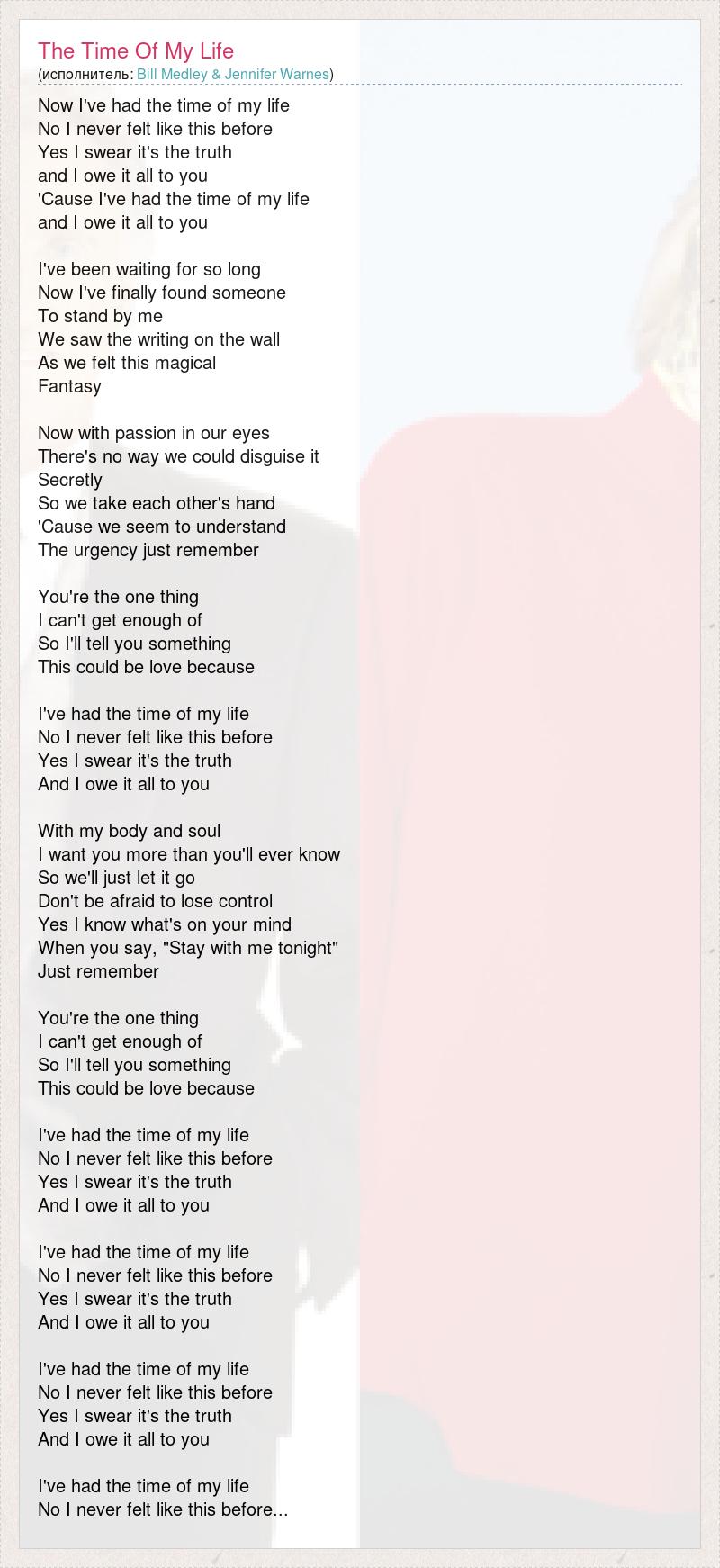 Now I've had the time of my life No I never felt like this before Yes I swear it's the truth and I owe it all to you 'Cause I've had the time of my life and I owe it all to you I've been waiting for so long Now I've finally found someone To stand by me We saw the writing on the wall As we felt this magical Fantasy Now with passion in our eyes There's no way we could disguise it Secretly So we take each other's hand 'Cause we seem to understand The urgency just remember You're the one thing I can't get enough of So I'll tell you something This could be love because I've had the time of my life No I never felt like this before Yes I swear it's the truth And I owe it all to you With my body and soul I want you more than you'll ever know So we'll just let it go Don't be afraid to lose control Yes I know what's on your mind When you say, "Stay with me tonight" Just remember You're the one thing I can't get enough of So I'll tell you something This could be love because I've had the time of my life No I never felt like this before Yes I swear it's the truth And I owe it all to you I've had the time of my life No I never felt like this before Yes I swear it's the truth And I owe it all to you I've had the time of my life No I never felt like this before Yes I swear it's the truth And I owe it all to you I've had the time of my life No I never felt like this before...