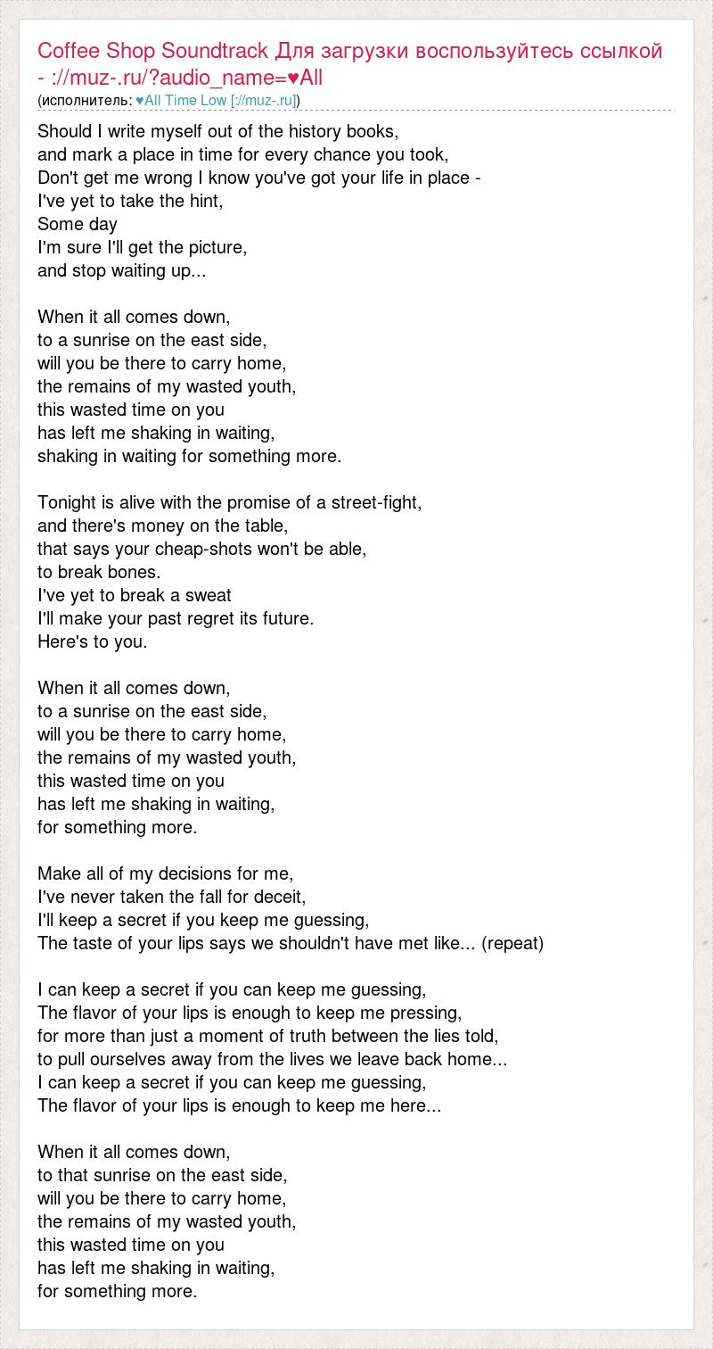 Should I write myself out of the history books, and mark a place in time for every chance you took, Don't get me wrong I know you've got your life in place - I've yet to take the hint, Some day I'm sure I'll get the picture, and stop waiting up... When it all comes down, to a sunrise on the east side, will you be there to carry home, the remains of my wasted youth, this wasted time on you has left me shaking in waiting, shaking in waiting for something more. Tonight is alive with the promise of a street-fight, and there's money on the table, that says your cheap-shots won't be able, to break bones. I've yet to break a sweat I'll make your past regret its future. Here's to you. When it all comes down, to a sunrise on the east side, will you be there to carry home, the remains of my wasted youth, this wasted time on you has left me shaking in waiting, for something more. Make all of my decisions for me, I've never taken the fall for deceit, I'll keep a secret if you keep me guessing, The taste of your lips says we shouldn't have met like... (repeat) I can keep a secret if you can keep me guessing, The flavor of your lips is enough to keep me pressing, for more than just a moment of truth between the lies told, to pull ourselves away from the lives we leave back home... I can keep a secret if you can keep me guessing, The flavor of your lips is enough to keep me here... When it all comes down, to that sunrise on the east side, will you be there to carry home, the remains of my wasted youth, this wasted time on you has left me shaking in waiting, for something more.