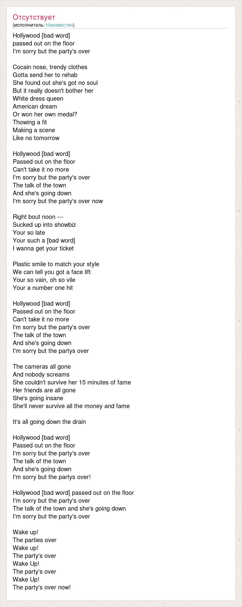 Hollywood [bad word] passed out on the floor I'm sorry but the party's over Cocain nose, trendy clothes Gotta send her to rehab She found out she's got no soul But it really doesn't bother her White dress queen American dream Or won her own medal? Thowing a fit Making a scene Like no tomorrow Hollywood [bad word] Passed out on the floor Can't take it no more I'm sorry but the party's over The talk of the town And she's going down I'm sorry but the party's over now Right bout noon --- Sucked up into showbiz Your so late Your such a [bad word] I wanna get your ticket Plastic smile to match your style We can tell you got a face lift Your so vain, oh so vile Your a number one hit Hollywood [bad word] Passed out on the floor Can't take it no more I'm sorry but the party's over The talk of the town And she's going down I'm sorry but the partys over The cameras all gone And nobody screams She couldn't survive her 15 minutes of fame Her friends are all gone She's going insane She'll never survive all the money and fame It's all going down the drain Hollywood [bad word] Passed out on the floor I'm sorry but the party's over The talk of the town And she's going down I'm sorry but the partys over! Hollywood [bad word] passed out on the floor I'm sorry but the party's over The talk of the town and she's going down I'm sorry but the party's over Wake up! The parties over Wake up! The party's over Wake Up! The party's over Wake Up! The party's over now!