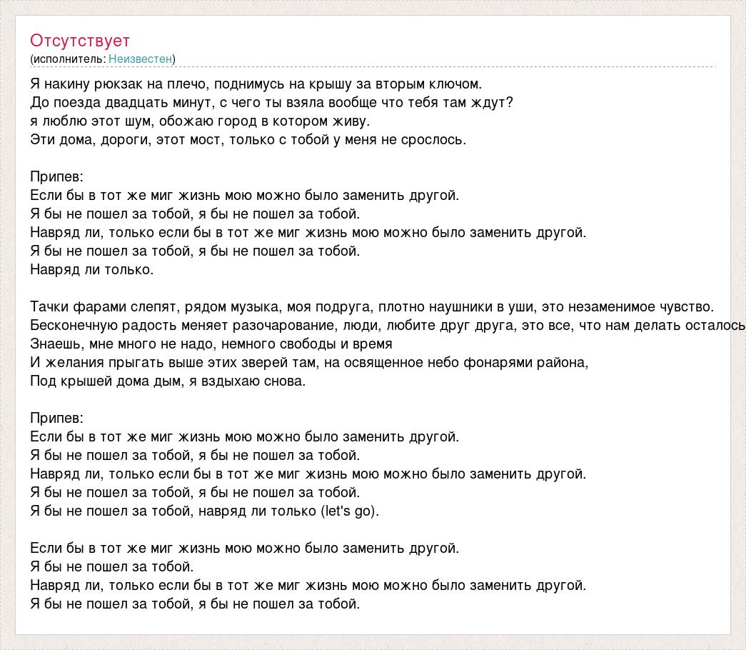 Я накину рюкзак на плечо, поднимусь на крышу за вторым ключом. До поезда двадцать минут, с чего ты взяла вообще что тебя там ждут? я люблю этот шум, обожаю город в котором живу. Эти дома, дороги, этот мост, только с тобой у меня не срослось. Припев: Если бы в тот же миг жизнь мою можно было заменить другой. Я бы не пошел за тобой, я бы не пошел за тобой. Навряд ли, только если бы в тот же миг жизнь мою можно было заменить другой. Я бы не пошел за тобой, я бы не пошел за тобой. Навряд ли только. Тачки фарами слепят, рядом музыка, моя подруга, плотно наушники в уши, это незаменимое чувство. Бесконечную радость меняет разочарование, люди, любите друг друга, это все, что нам делать осталось Знаешь, мне много не надо, немного свободы и время И желания прыгать выше этих зверей там, на освященное небо фонарями района, Под крышей дома дым, я вздыхаю снова. Припев: Если бы в тот же миг жизнь мою можно было заменить другой. Я бы не пошел за тобой, я бы не пошел за тобой. Навряд ли, только если бы в тот же миг жизнь мою можно было заменить другой. Я бы не пошел за тобой, я бы не пошел за тобой. Я бы не пошел за тобой, навряд ли только (let's go). Если бы в тот же миг жизнь мою можно было заменить другой. Я бы не пошел за тобой. Навряд ли, только если бы в тот же миг жизнь мою можно было заменить другой. Я бы не пошел за тобой, я бы не пошел за тобой.