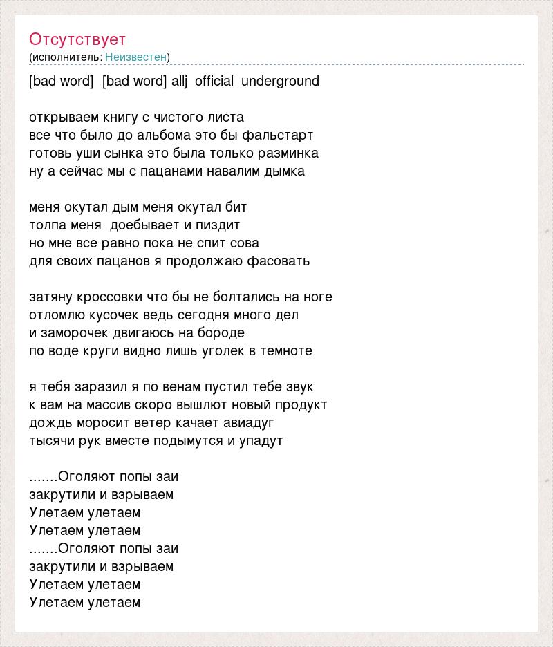 [bad word] [bad word] allj_official_underground открываем книгу с чистого листа все что было до альбома это бы фальстарт готовь уши сынка это была только разминка ну а сейчас мы с пацанами навалим дымка меня окутал дым меня окутал бит толпа меня доебывает и пиздит но мне все равно пока не спит сова для своих пацанов я продолжаю фасовать затяну кроссовки что бы не болтались на ноге отломлю кусочек ведь сегодня много дел и заморочек двигаюсь на бороде по воде круги видно лишь уголек в темноте я тебя заразил я по венам пустил тебе звук к вам на массив скоро вышлют новый продукт дождь моросит ветер качает авиадуг тысячи рук вместе подымутся и упадут .......Оголяют попы заи закрутили и взрываем Улетаем улетаем Улетаем улетаем .......Оголяют попы заи закрутили и взрываем Улетаем улетаем Улетаем улетаем