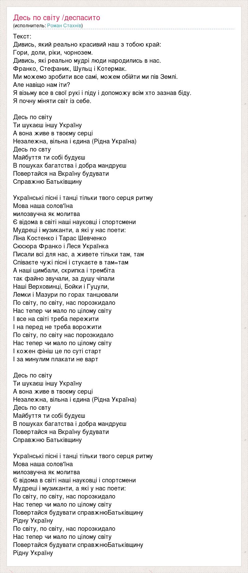 Текст: Дивись, який реально красивий наш з тобою край: Гори, доли, ріки, чорнозем. Дивись, які реально мудрі люди народились в нас. Франко, Стефаник, Шульц і Котермак. Ми можемо зробити все самі, можем обійти ми пів Землі. Але навіщо нам іти? Я візьму все в свої рукі і піду і допоможу всім хто зазнав біду. Я почну міняти світ із себе. Десь по світу Ти шукаєш іншу Україну А вона живе в твоєму серці Незалежна, вільна і єдина (Рідна Україна) Десь по свту Майбуття ти собі будуєш В пошуках багатства і добра мандруєш Повертайся на Вкраїну будувати Справжню Батьківщину Українські пісні і танці тільки твого серця ритму Мова наша солов'їна милозвучна як молитва Є відома в світі наші науковці і спортсмени Мудреці і музиканти, а які у нас поети: Ліна Костенко і Тарас Шевченко Сюсюра Франко і Леся Українка Писали всі для нас, а живете тільки там, там Співаєте чужі пісні і стукаєте в там=там А наші цимбали, скрипка і трембіта так файно звучали, за душу чіпали Наші Верховинці, Бойки і Гуцули, Лемки і Мазури по горах танцювали По світу, по світу, нас порозкидало Нас тепер чи мало по цілому світу І все на світі треба пережити І на перед не треба ворожити По світу, по світу нас порозкидало Нас тепер чи мало по цілому світу І кожен фініш це по суті старт І за минулим плакати не варт Десь по світу Ти шукаєш іншу Україну А вона живе в твоєму серці Незалежна, вільна і єдина (Рідна Україна) Десь по свту Майбуття ти собі будуєш В пошуках багатства і добра мандруєш Повертайся на Вкраїну будувати Справжню Батьківщину Українські пісні і танці тільки твого серця ритму Мова наша солов'їна милозвучна як молитва Є відома в світі наші науковці і спортсмени Мудреці і музиканти, а які у нас поети: По світу, по світу, нас порозкидало Нас тепер чи мало по цілому світу Повертайся будувати справжнюБатьківщину Рідну Україну По світу, по світу, нас порозкидало Нас тепер чи мало по цілому світу Повертайся будувати справжнюБатьківщину Рідну Україну