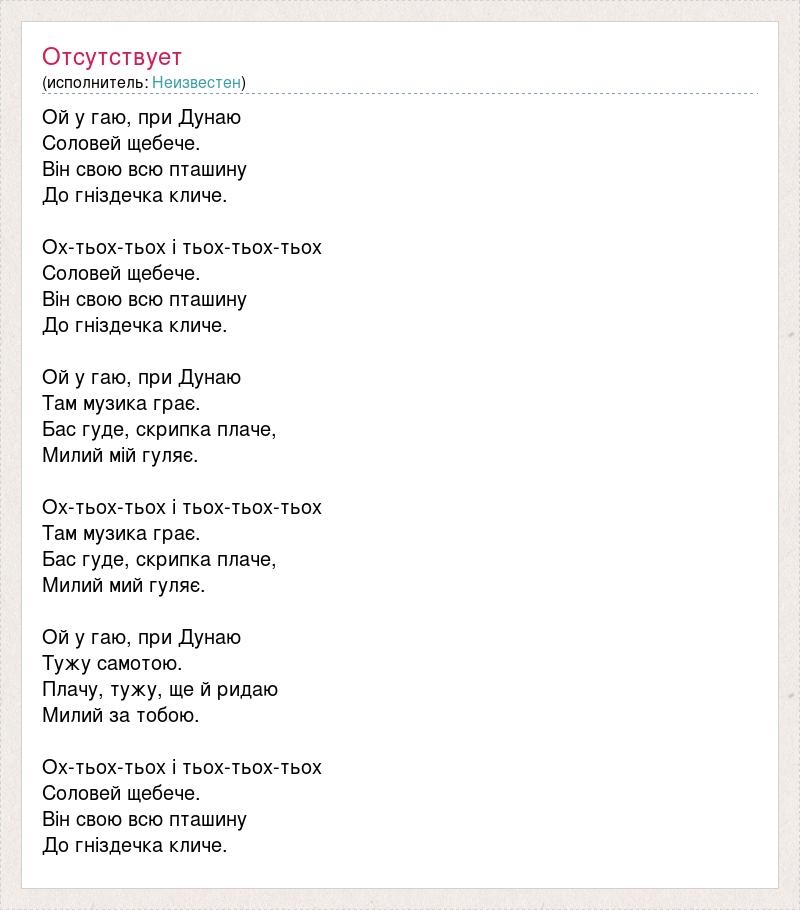Ой у гаю, при Дунаю Соловей щебече. Він свою всю пташину До гніздечка кличе. Ох-тьох-тьох і тьох-тьох-тьох Соловей щебече. Він свою всю пташину До гніздечка кличе. Ой у гаю, при Дунаю Там музика грає. Бас гуде, скрипка плаче, Милий мій гуляє. Ох-тьох-тьох і тьох-тьох-тьох Там музика грає. Бас гуде, скрипка плаче, Милий мий гуляє. Ой у гаю, при Дунаю Тужу самотою. Плачу, тужу, ще й ридаю Милий за тобою. Ох-тьох-тьох і тьох-тьох-тьох Соловей щебече. Він свою всю пташину До гніздечка кличе.
