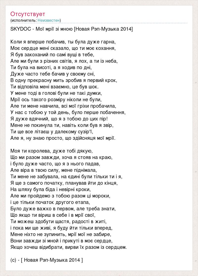 SKYDOC - Мої мрії зі мною [Новая Рэп-Музыка 2014] Коли я вперше побачив, ты була дуже гарна, Моє сердце мені сказало, що ти моє кохання, Я був закоханий по самі вущі в тебе, Але ми були з різних світів, я лох, а ти із неба, Ти була на висоті, а я ходив по дні, Дуже часто тебе бачив у своєму сні, В одну прекрасну мить зробив я первий крок, Ти відповіла мені взаємно, це був шок. У мене тоді в голові були не такі думки, Мрії ось такого розміру ніколи не були, Але ти мене навчила, всі мої гріхи пробачила, У нас с тобою у той день, було перше побачення, Я дуже вдячний, що я з тобою до цих пір! Мене не покинула ти, навіть коли був я звір, Ти ще все літаєш у далекому сузір'ї, Але я, ну знаю просто, що здійсняця мої мрії. Моя ти королева, дуже тобі дякую, Що ми разом завжди, хоча я стояв на краю, і було дуже часто, що я з нього падав, Але віра в твою силу, мене піднімала, Ти мене не забувала, на єдині були тільки ти і я, Я ще з самого початку, планував йти до кінця, На шляху була біда і невірні кроки, Але ми пройдемо з тобою разом ці мороки, і це тільки початок другого етапа, Було дуже важко в первом, але треба знати, Що якщо ти віриш в себе і в мрії свої, Ти можеш здобути щастя, радості в житі, і пока ми ще живі, я буду йти тільки вперед, Мене ніхто не зупинить, мрії мої не забире, Вони завжди зі мной і прикуті в моє сердце, Якщо хочеш відибрати, вирви їх разом із сердцем. (c) - [ Новая Рэп-Музыка 2014 ]