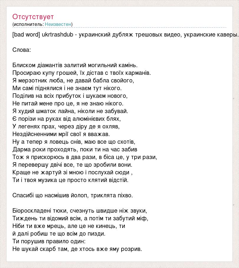 [bad word] ukrtrashdub - украинский дубляж трешовых видео, украинские каверы. Слова: Блиском діамантів залитий могильний камінь. Просираю купу грошей, їх дістав с твоїх карманів. Я мерзотник люба, не давай бабла свойого, Ми самі піднялися і не знаєм тут нікого. Поділив на всіх прибуток і шукаєм нового, Не питай мене про це, я не знаю нікого. Я худий шматок лайна, ніколи не забувай. Є порізи на руках від алюмінієвих блях, У легенях прах, через діру де я охляв, Нездійсненними мрії свої я вважав. Ну а тепер я ловець снів, маю все що схотів, Дарма роки проходять, поки ти на час забив Тож я прискорюсь в два рази, в біса це, у три рази, Я перевершу двічі все, те що зробили вони. Краще не жартуй зі мною і послухай сюди , Ти і твоя музика це просто клятий відстій. Спасибі що насмішив йолоп, триклята піхво. Біороскладені тюки, счезнуть швидше ніж звуки, Тиждень ти відомий всім, а потім ти забутий міф, Ніби ти вже мрець, але це не кинець, ти й далі робиш те що всім до пизди. Ти порушив правило один: Не шукай скарб там, де хтось вже яму розрив.