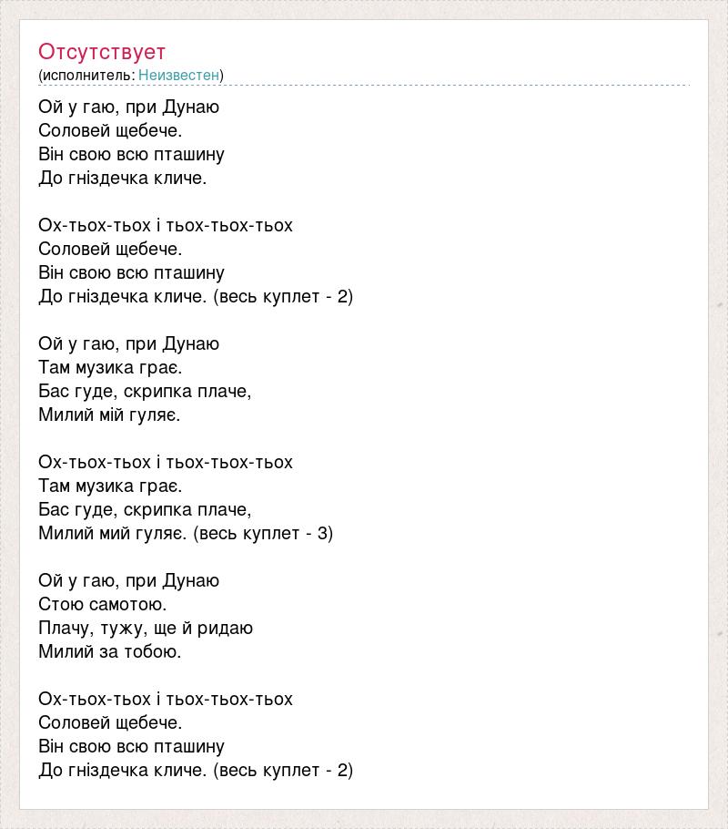Ой у гаю, при Дунаю Соловей щебече. Він свою всю пташину До гніздечка кличе. Ох-тьох-тьох і тьох-тьох-тьох Соловей щебече. Він свою всю пташину До гніздечка кличе. (весь куплет - 2) Ой у гаю, при Дунаю Там музика грає. Бас гуде, скрипка плаче, Милий мій гуляє. Ох-тьох-тьох і тьох-тьох-тьох Там музика грає. Бас гуде, скрипка плаче, Милий мий гуляє. (весь куплет - 3) Ой у гаю, при Дунаю Стою самотою. Плачу, тужу, ще й ридаю Милий за тобою. Ох-тьох-тьох і тьох-тьох-тьох Соловей щебече. Він свою всю пташину До гніздечка кличе. (весь куплет - 2)