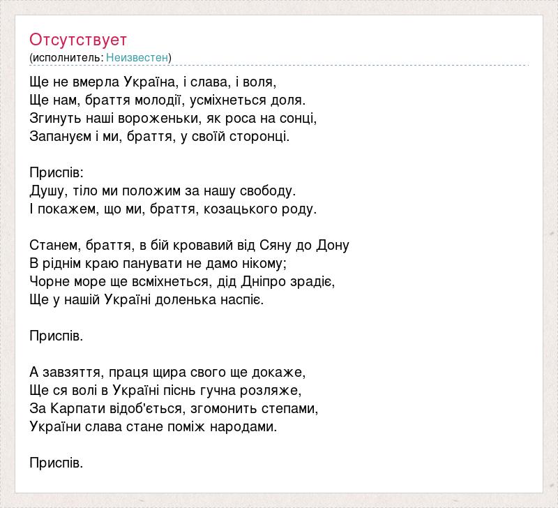 Ще не вмерла Україна, і слава, і воля, Ще нам, браття молодії, усміхнеться доля. Згинуть наші вороженьки, як роса на сонці, Запануєм і ми, браття, у своїй сторонці. Приспів: Душу, тіло ми положим за нашу свободу. І покажем, що ми, браття, козацького роду. Станем, браття, в бій кровавий від Сяну до Дону В ріднім краю панувати не дамо нікому; Чорне море ще всміхнеться, дід Дніпро зрадіє, Ще у нашій Україні доленька наспіє. Приспів. А завзяття, праця щира свого ще докаже, Ще ся волі в Україні піснь гучна розляже, За Карпати відоб'ється, згомонить степами, України слава стане поміж народами. Приспів.
