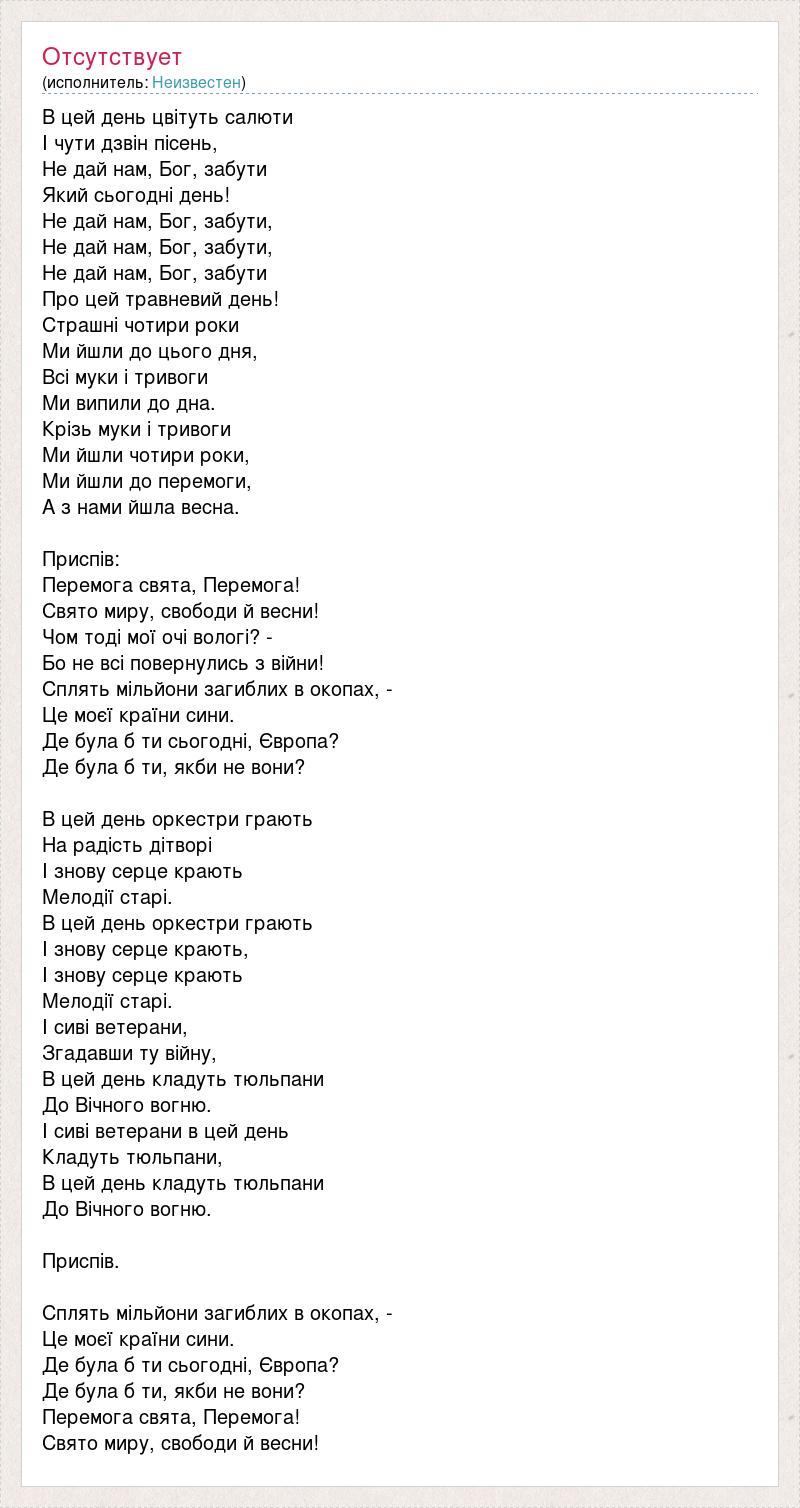 В цей день цвітуть салюти І чути дзвін пісень, Не дай нам, Бог, забути Який сьогодні день! Не дай нам, Бог, забути, Не дай нам, Бог, забути, Не дай нам, Бог, забути Про цей травневий день! Страшні чотири роки Ми йшли до цього дня, Всі муки і тривоги Ми випили до дна. Крізь муки і тривоги Ми йшли чотири роки, Ми йшли до перемоги, А з нами йшла весна. Приспів: Перемога свята, Перемога! Свято миру, свободи й весни! Чом тоді мої очі вологі? - Бо не всі повернулись з війни! Сплять мільйони загиблих в окопах, - Це моєї країни сини. Де була б ти сьогодні, Європа? Де була б ти, якби не вони? В цей день оркестри грають На радість дітворі І знову серце крають Мелодії старі. В цей день оркестри грають І знову серце крають, І знову серце крають Мелодії старі. І сиві ветерани, Згадавши ту війну, В цей день кладуть тюльпани До Вічного вогню. І сиві ветерани в цей день Кладуть тюльпани, В цей день кладуть тюльпани До Вічного вогню. Приспів. Сплять мільйони загиблих в окопах, - Це моєї країни сини. Де була б ти сьогодні, Європа? Де була б ти, якби не вони? Перемога свята, Перемога! Свято миру, свободи й весни!