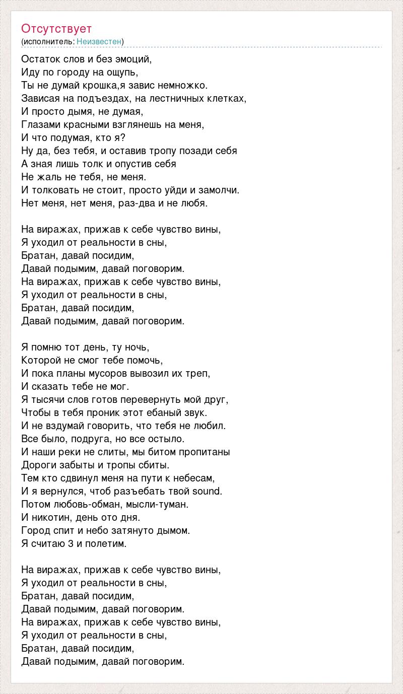 Остаток слов и без эмоций, Иду по городу на ощупь, Ты не думай крошка,я завис немножко. Зависая на подъездах, на лестничных клетках, И просто дымя, не думая, Глазами красными взглянешь на меня, И что подумая, кто я? Ну да, без тебя, и оставив тропу позади себя А зная лишь толк и опустив себя Не жаль не тебя, не меня. И толковать не стоит, просто уйди и замолчи. Нет меня, нет меня, раз-два и не любя. На виражах, прижав к себе чувство вины, Я уходил от реальности в сны, Братан, давай посидим, Давай подымим, давай поговорим. На виражах, прижав к себе чувство вины, Я уходил от реальности в сны, Братан, давай посидим, Давай подымим, давай поговорим. Я помню тот день, ту ночь, Которой не смог тебе помочь, И пока планы мусоров вывозил их треп, И сказать тебе не мог. Я тысячи слов готов перевернуть мой друг, Чтобы в тебя проник этот ебаный звук. И не вздумай говорить, что тебя не любил. Все было, подруга, но все остыло. И наши реки не слиты, мы битом пропитаны Дороги забыты и тропы сбиты. Тем кто сдвинул меня на пути к небесам, И я вернулся, чтоб разъебать твой sound. Потом любовь-обман, мысли-туман. И никотин, день ото дня. Город спит и небо затянуто дымом. Я считаю 3 и полетим. На виражах, прижав к себе чувство вины, Я уходил от реальности в сны, Братан, давай посидим, Давай подымим, давай поговорим. На виражах, прижав к себе чувство вины, Я уходил от реальности в сны, Братан, давай посидим, Давай подымим, давай поговорим.