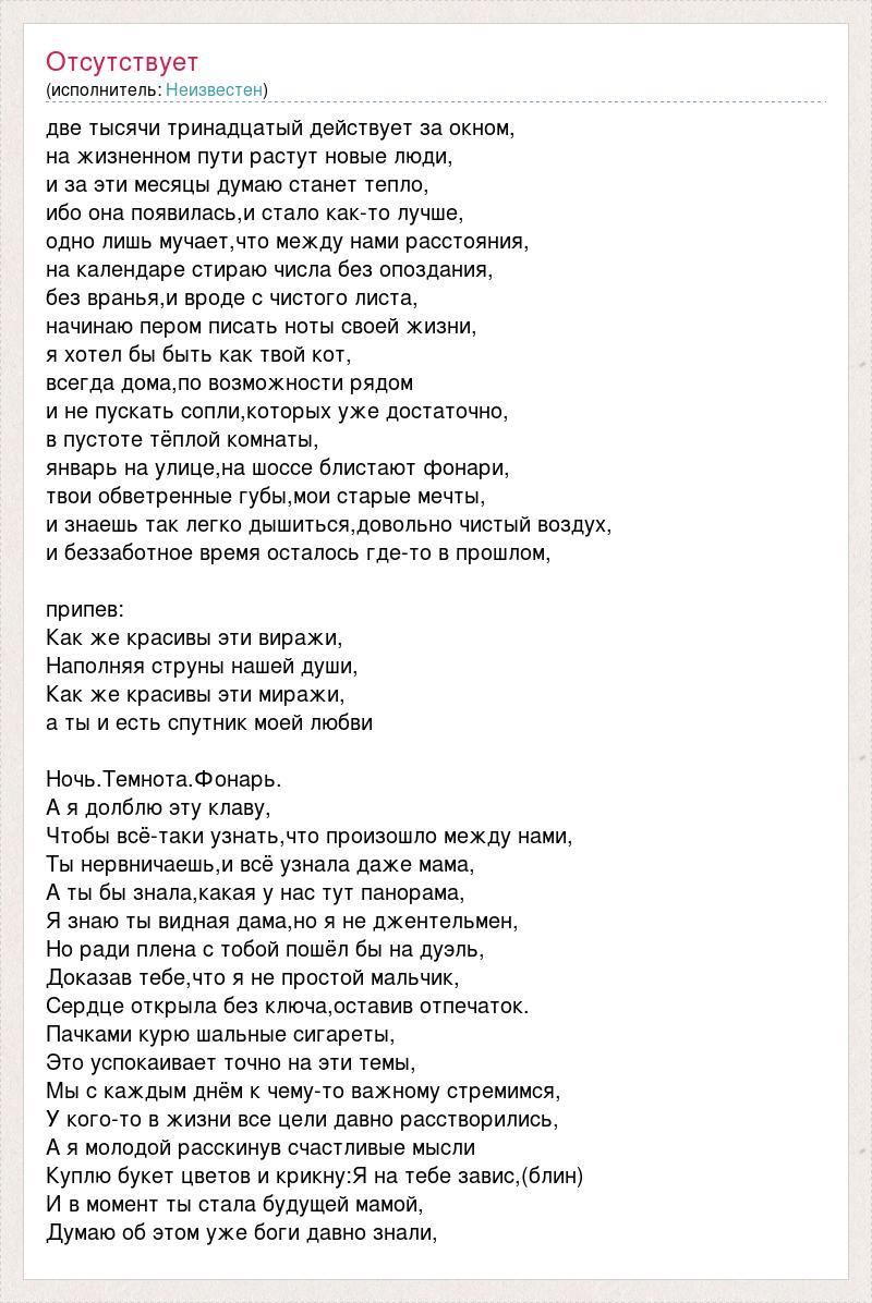 две тысячи тринадцатый действует за окном, на жизненном пути растут новые люди, и за эти месяцы думаю станет тепло, ибо она появилась,и стало как-то лучше, одно лишь мучает,что между нами расстояния, на календаре стираю числа без опоздания, без вранья,и вроде с чистого листа, начинаю пером писать ноты своей жизни, я хотел бы быть как твой кот, всегда дома,по возможности рядом и не пускать сопли,которых уже достаточно, в пустоте тёплой комнаты, январь на улице,на шоссе блистают фонари, твои обветренные губы,мои старые мечты, и знаешь так легко дышиться,довольно чистый воздух, и беззаботное время осталось где-то в прошлом, припев: Как же красивы эти виражи, Наполняя струны нашей души, Как же красивы эти миражи, а ты и есть спутник моей любви Ночь.Темнота.Фонарь. А я долблю эту клаву, Чтобы всё-таки узнать,что произошло между нами, Ты нервничаешь,и всё узнала даже мама, А ты бы знала,какая у нас тут панорама, Я знаю ты видная дама,но я не джентельмен, Но ради плена с тобой пошёл бы на дуэль, Доказав тебе,что я не простой мальчик, Сердце открыла без ключа,оставив отпечаток. Пачками курю шальные сигареты, Это успокаивает точно на эти темы, Мы с каждым днём к чему-то важному стремимся, У кого-то в жизни все цели давно расстворились, А я молодой расскинув счастливые мысли Куплю букет цветов и крикну:Я на тебе завис,(блин) И в момент ты стала будущей мамой, Думаю об этом уже боги давно знали,
