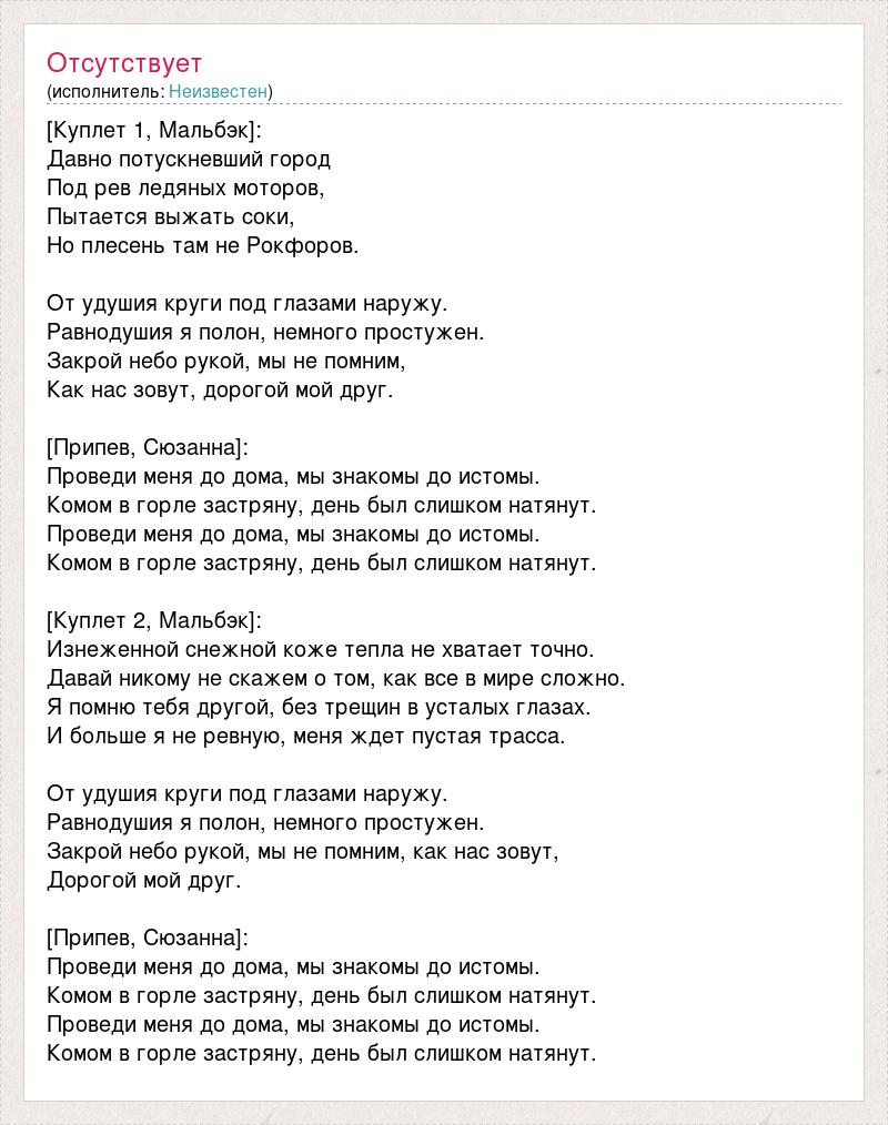 [Куплет 1, Мальбэк]: Давно потускневший город Под рев ледяных моторов, Пытается выжать соки, Но плесень там не Рокфоров. От удушия круги под глазами наружу. Равнодушия я полон, немного простужен. Закрой небо рукой, мы не помним, Как нас зовут, дорогой мой друг. [Припев, Сюзанна]: Проведи меня до дома, мы знакомы до истомы. Комом в горле застряну, день был слишком натянут. Проведи меня до дома, мы знакомы до истомы. Комом в горле застряну, день был слишком натянут. [Куплет 2, Мальбэк]: Изнеженной снежной коже тепла не хватает точно. Давай никому не скажем о том, как все в мире сложно. Я помню тебя другой, без трещин в усталых глазах. И больше я не ревную, меня ждет пустая трасса. От удушия круги под глазами наружу. Равнодушия я полон, немного простужен. Закрой небо рукой, мы не помним, как нас зовут, Дорогой мой друг. [Припев, Сюзанна]: Проведи меня до дома, мы знакомы до истомы. Комом в горле застряну, день был слишком натянут. Проведи меня до дома, мы знакомы до истомы. Комом в горле застряну, день был слишком натянут.