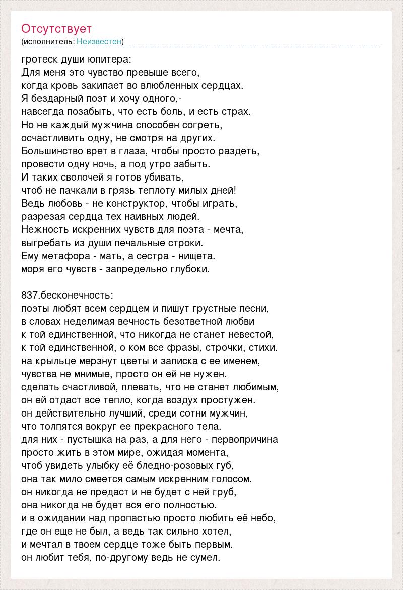 гротеск души юпитера: Для меня это чувство превыше всего, когда кровь закипает во влюбленных сердцах. Я бездарный поэт и хочу одного,- навсегда позабыть, что есть боль, и есть страх. Но не каждый мужчина способен согреть, осчастливить одну, не смотря на других. Большинство врет в глаза, чтобы просто раздеть, провести одну ночь, а под утро забыть. И таких сволочей я готов убивать, чтоб не пачкали в грязь теплоту милых дней! Ведь любовь - не конструктор, чтобы играть, разрезая сердца тех наивных людей. Нежность искренних чувств для поэта - мечта, выгребать из души печальные строки. Ему метафора - мать, а сестра - нищета. моря его чувств - запредельно глубоки. 837.бесконечность: поэты любят всем сердцем и пишут грустные песни, в словах неделимая вечность безответной любви к той единственной, что никогда не станет невестой, к той единственной, о ком все фразы, строчки, стихи. на крыльце мерзнут цветы и записка с ее именем, чувства не мнимые, просто он ей не нужен. сделать счастливой, плевать, что не станет любимым, он ей отдаст все тепло, когда воздух простужен. он действительно лучший, среди сотни мужчин, что толпятся вокруг ее прекрасного тела. для них - пустышка на раз, а для него - первопричина просто жить в этом мире, ожидая момента, чтоб увидеть улыбку её бледно-розовых губ, она так мило смеется самым искренним голосом. он никогда не предаст и не будет с ней груб, она никогда не будет вся его полностью. и в ожидании над пропастью просто любить её небо, где он еще не был, а ведь так сильно хотел, и мечтал в твоем сердце тоже быть первым. он любит тебя, по-другому ведь не сумел.