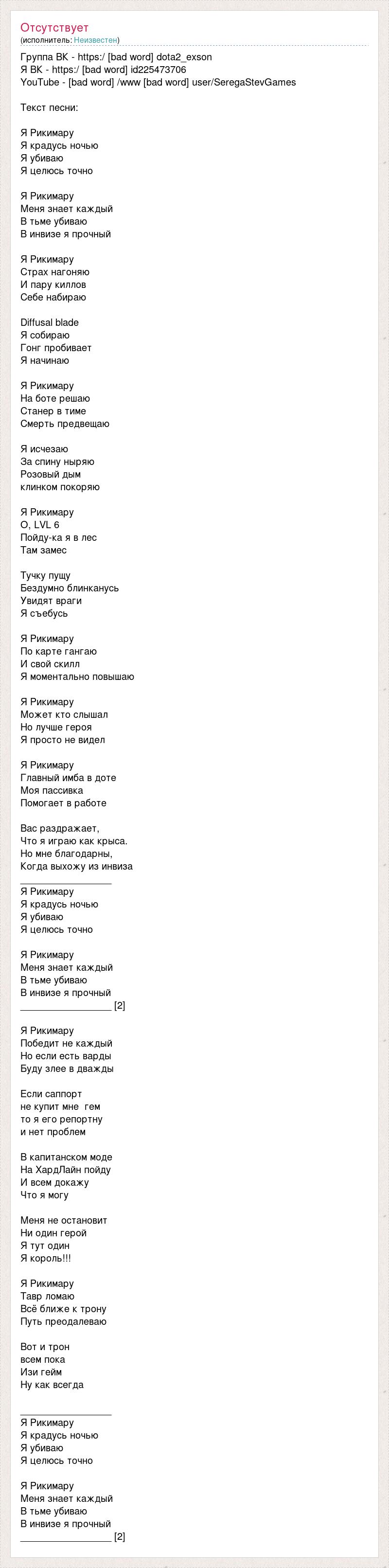 Группа ВК - https:/ [bad word] dota2_exson Я ВК - https:/ [bad word] id225473706 YouTube - [bad word] /www [bad word] user/SeregaStevGames Текст песни: Я Рикимару Я крадусь ночью Я убиваю Я целюсь точно Я Рикимару Меня знает каждый В тьме убиваю В инвизе я прочный Я Рикимару Страх нагоняю И пару киллов Себе набираю Diffusal blade Я собираю Гонг пробивает Я начинаю Я Рикимару На боте решаю Станер в тиме Смерть предвещаю Я исчезаю За спину ныряю Розовый дым клинком покоряю Я Рикимару О, LVL 6 Пойду-ка я в лес Там замес Тучку пущу Бездумно блинканусь Увидят враги Я съебусь Я Рикимару По карте гангаю И свой скилл Я моментально повышаю Я Рикимару Может кто слышал Но лучше героя Я просто не видел Я Рикимару Главный имба в доте Моя пассивка Помогает в работе Вас раздражает, Что я играю как крыса. Но мне благодарны, Когда выхожу из инвиза _________________ Я Рикимару Я крадусь ночью Я убиваю Я целюсь точно Я Рикимару Меня знает каждый В тьме убиваю В инвизе я прочный _________________ [2] Я Рикимару Победит не каждый Но если есть варды Буду злее в дважды Если саппорт не купит мне гем то я его репортну и нет проблем В капитанском моде На ХардЛайн пойду И всем докажу Что я могу Меня не остановит Ни один герой Я тут один Я король!!! Я Рикимару Тавр ломаю Всё ближе к трону Путь преодалеваю Вот и трон всем пока Изи гейм Ну как всегда _________________ Я Рикимару Я крадусь ночью Я убиваю Я целюсь точно Я Рикимару Меня знает каждый В тьме убиваю В инвизе я прочный _________________ [2]