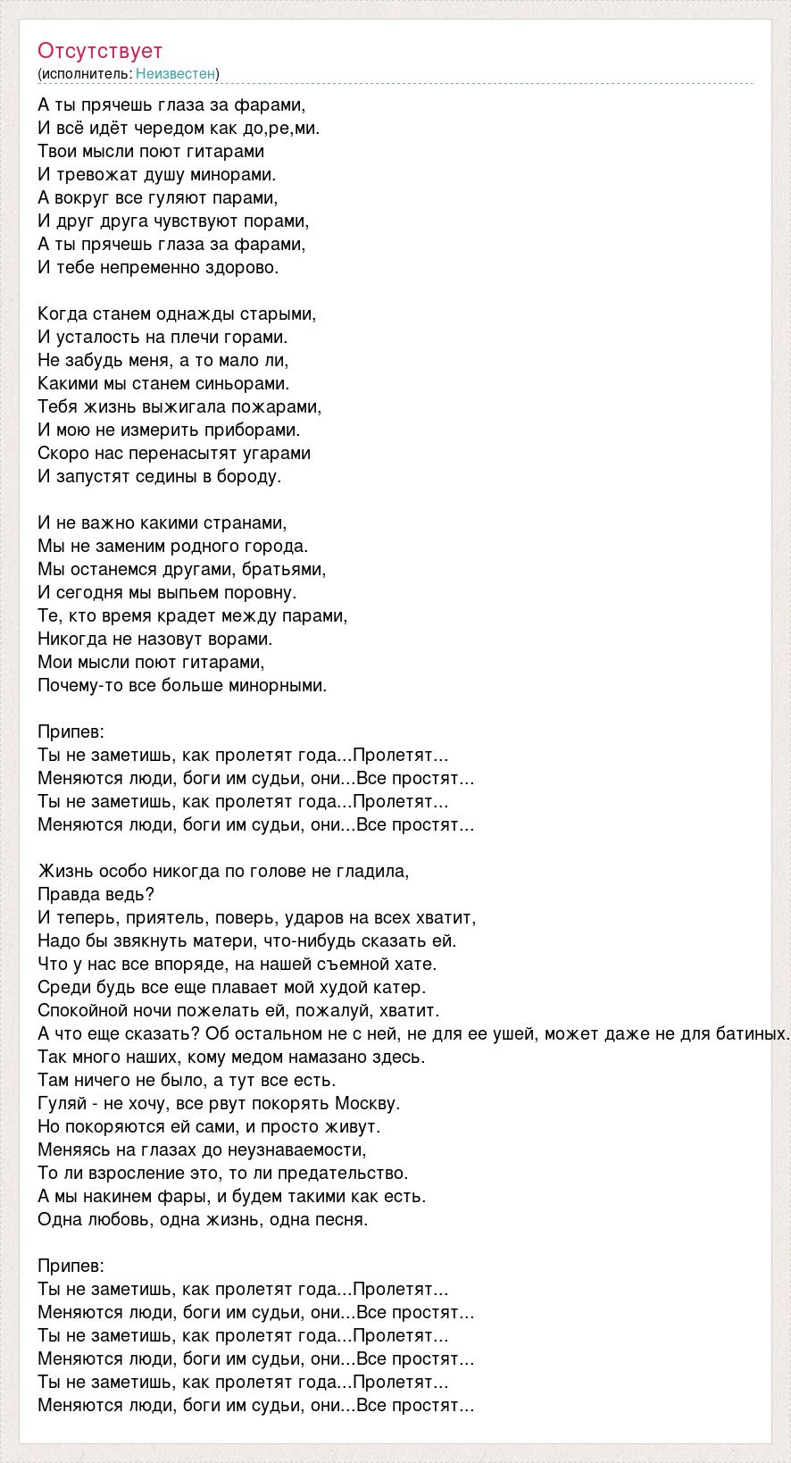 А ты прячешь глаза за фарами, И всё идёт чередом как до,ре,ми. Твои мысли поют гитарами И тревожат душу минорами. А вокруг все гуляют парами, И друг друга чувствуют порами, А ты прячешь глаза за фарами, И тебе непременно здорово. Когда станем однажды старыми, И усталость на плечи горами. Не забудь меня, а то мало ли, Какими мы станем синьорами. Тебя жизнь выжигала пожарами, И мою не измерить приборами. Скоро нас перенасытят угарами И запустят седины в бороду. И не важно какими странами, Мы не заменим родного города. Мы останемся другами, братьями, И сегодня мы выпьем поровну. Те, кто время крадет между парами, Никогда не назовут ворами. Мои мысли поют гитарами, Почему-то все больше минорными. Припев: Ты не заметишь, как пролетят года...Пролетят... Меняются люди, боги им судьи, они...Все простят... Ты не заметишь, как пролетят года...Пролетят... Меняются люди, боги им судьи, они...Все простят... Жизнь особо никогда по голове не гладила, Правда ведь? И теперь, приятель, поверь, ударов на всех хватит, Надо бы звякнуть матери, что-нибудь сказать ей. Что у нас все впоряде, на нашей съемной хате. Среди будь все еще плавает мой худой катер. Спокойной ночи пожелать ей, пожалуй, хватит. А что еще сказать? Об остальном не с ней, не для ее ушей, может даже не для батиных. Так много наших, кому медом намазано здесь. Там ничего не было, а тут все есть. Гуляй - не хочу, все рвут покорять Москву. Но покоряются ей сами, и просто живут. Меняясь на глазах до неузнаваемости, То ли взросление это, то ли предательство. А мы накинем фары, и будем такими как есть. Одна любовь, одна жизнь, одна песня. Припев: Ты не заметишь, как пролетят года...Пролетят... Меняются люди, боги им судьи, они...Все простят... Ты не заметишь, как пролетят года...Пролетят... Меняются люди, боги им судьи, они...Все простят... Ты не заметишь, как пролетят года...Пролетят... Меняются люди, боги им судьи, они...Все простят...