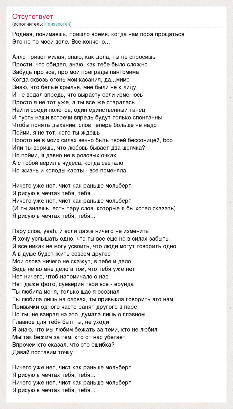 Родная, понимаешь, пришло время, когда нам пора прощаться Это не по моей воле. Все кончено... Алло привет милая, знаю, как дела, ты не спросишь Прости, что обидел, знаю, как тебе было сложно Забудь про все, про мои преграды пантомима Когда сквозь огонь мои касания, да...мимо Знаю, что белые крылья, мне были не к лицу И не ведал впредь, что вырасту если изменюсь Просто я не тот уже, а ты все же старалась Найти среди полетов, один единственный танец И пусть наши встречи впредь будут только спонтанны Чтобы понять дыхание, слов теперь больше не надо Пойми, я не тот, кого ты ждешь Просто не в моих силах вечно быть твоей бессоницей, boo Или ты веришь, что любовь бывает два щелчка? Но пойми, я давно не в розовых очках А с тобой верил в чудеса, когда светало Но жизнь и колоды карты - все поменяла Ничего уже нет, чист как раньше мольберт Я рисую в мечтах тебя, тебя... Ничего уже нет, чист как раньше мольберт (И ты знаешь, есть пару слов, которые я бы хотел сказать) Я рисую в мечтах тебя, тебя... Пару слов, yeah, и если даже ничего не изменить Я хочу услышать одно, что ты все еще не в силах забыть Я все никак не могу усвоить, что люди могут говорить одно А в душе будет жить совсем другое Мои слова ничего не скажут, в тебе и дело Ведь не во мне дело в том, что тебя уже нет Нет ничего, чтоб напоминало о нас Нет даже фото, суеверия твои все - ерунда Ты любила меня, только щас я осознал Ты любила лишь на словах, ты привыкла говорить это нам Привычки одного часто ранят другого в паре Но ты, не взирая на это, думала лишь о главном Главное для тебя был ты, не уходи Я знаю, что мы любим бежать за теми, кто не любил Мы так бежим за тем, кто от нас убегает Впрочем кто сказал, что это ошибка? Давай поставим точку. Ничего уже нет, чист как раньше мольберт Я рисую в мечтах тебя, тебя... Ничего уже нет, чист как раньше мольберт Я рисую в мечтах тебя, тебя...