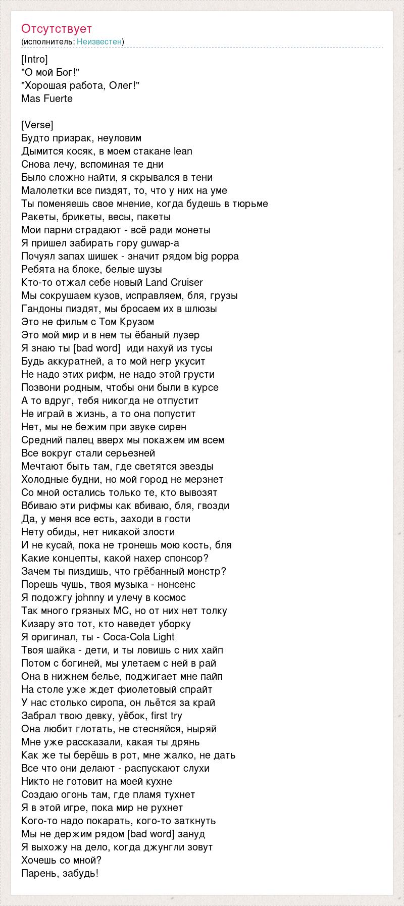 [Intro] "О мой Бог!" "Хорошая работа, Олег!" Mas Fuerte [Verse] Будто призрак, неуловим Дымится косяк, в моем стакане lean Снова лечу, вспоминая те дни Было сложно найти, я скрывался в тени Малолетки все пиздят, то, что у них на уме Ты поменяешь свое мнение, когда будешь в тюрьме Ракеты, брикеты, весы, пакеты Мои парни страдают - всё ради монеты Я пришел забирать гору guwap-а Почуял запах шишек - значит рядом big poppa Ребята на блоке, белые шузы Кто-то отжал себе новый Land Cruiser Мы сокрушаем кузов, исправляем, бля, грузы Гандоны пиздят, мы бросаем их в шлюзы Это не фильм с Том Крузом Это мой мир и в нем ты ёбаный лузер Я знаю ты [bad word] иди нахуй из тусы Будь аккуратней, а то мой негр укусит Не надо этих рифм, не надо этой грусти Позвони родным, чтобы они были в курсе А то вдруг, тебя никогда не отпустит Не играй в жизнь, а то она попустит Нет, мы не бежим при звуке сирен Средний палец вверх мы покажем им всем Все вокруг стали серьезней Мечтают быть там, где светятся звезды Холодные будни, но мой город не мерзнет Со мной остались только те, кто вывозят Вбиваю эти рифмы как вбиваю, бля, гвозди Да, у меня все есть, заходи в гости Нету обиды, нет никакой злости И не кусай, пока не тронешь мою кость, бля Какие концепты, какой нахер спонсор? Зачем ты пиздишь, что грёбанный монстр? Порешь чушь, твоя музыка - нонсенс Я подожгу johnny и улечу в космос Так много грязных МС, но от них нет толку Кизару это тот, кто наведет уборку Я оригинал, ты - Coca-Cola Light Твоя шайка - дети, и ты ловишь с них хайп Потом с богиней, мы улетаем с ней в рай Она в нижнем белье, поджигает мне пайп На столе уже ждет фиолетовый спрайт У нас столько сиропа, он льётся за край Забрал твою девку, уёбок, first try Она любит глотать, не стесняйся, ныряй Мне уже рассказали, какая ты дрянь Как же ты берёшь в рот, мне жалко, не дать Все что они делают - распускают слухи Никто не готовит на моей кухне Создаю огонь там, где пламя тухнет Я в этой игре, пока мир не рухнет Кого-то надо покарать, кого-то заткнуть Мы не держим рядом [bad word] зануд Я выхожу на дело, когда джунгли зовут Хочешь со мной? Парень, забудь!
