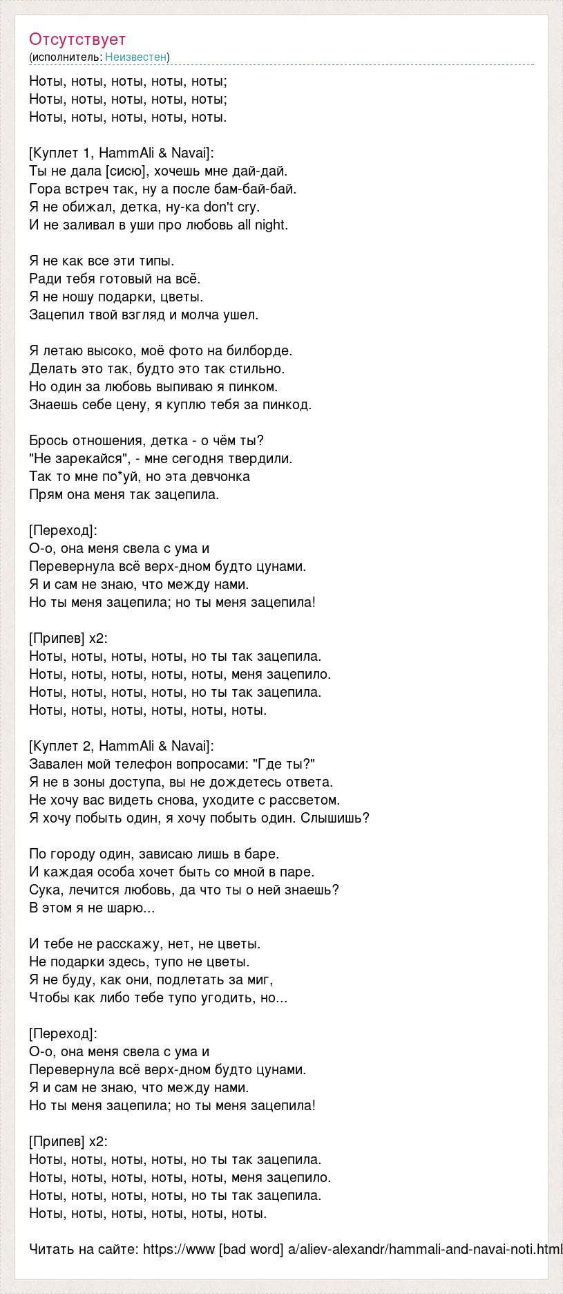 Ноты, ноты, ноты, ноты, ноты; Ноты, ноты, ноты, ноты, ноты; Ноты, ноты, ноты, ноты, ноты. [Куплет 1, HammAli & Navai]: Ты не дала [сисю], хочешь мне дай-дай. Гора встреч так, ну а после бам-бай-бай. Я не обижал, детка, ну-ка don't cry. И не заливал в уши про любовь all night. Я не как все эти типы. Ради тебя готовый на всё. Я не ношу подарки, цветы. Зацепил твой взгляд и молча ушел. Я летаю высоко, моё фото на билборде. Делать это так, будто это так стильно. Но один за любовь выпиваю я пинком. Знаешь себе цену, я куплю тебя за пинкод. Брось отношения, детка - о чём ты? "Не зарекайся", - мне сегодня твердили. Так то мне по*уй, но эта девчонка Прям она меня так зацепила. [Переход]: О-о, она меня свела с ума и Перевернула всё верх-дном будто цунами. Я и сам не знаю, что между нами. Но ты меня зацепила; но ты меня зацепила! [Припев] x2: Ноты, ноты, ноты, ноты, но ты так зацепила. Ноты, ноты, ноты, ноты, ноты, меня зацепило. Ноты, ноты, ноты, ноты, но ты так зацепила. Ноты, ноты, ноты, ноты, ноты, ноты. [Куплет 2, HammAli & Navai]: Завален мой телефон вопросами: "Где ты?" Я не в зоны доступа, вы не дождетесь ответа. Не хочу вас видеть снова, уходите с рассветом. Я хочу побыть один, я хочу побыть один. Слышишь? По городу один, зависаю лишь в баре. И каждая особа хочет быть со мной в паре. Сука, лечится любовь, да что ты о ней знаешь? В этом я не шарю... И тебе не расскажу, нет, не цветы. Не подарки здесь, тупо не цветы. Я не буду, как они, подлетать за миг, Чтобы как либо тебе тупо угодить, но... [Переход]: О-о, она меня свела с ума и Перевернула всё верх-дном будто цунами. Я и сам не знаю, что между нами. Но ты меня зацепила; но ты меня зацепила! [Припев] x2: Ноты, ноты, ноты, ноты, но ты так зацепила. Ноты, ноты, ноты, ноты, ноты, меня зацепило. Ноты, ноты, ноты, ноты, но ты так зацепила. Ноты, ноты, ноты, ноты, ноты, ноты. Читать на сайте: https://www [bad word] a/aliev-alexandr/hammali-and-navai-noti.html