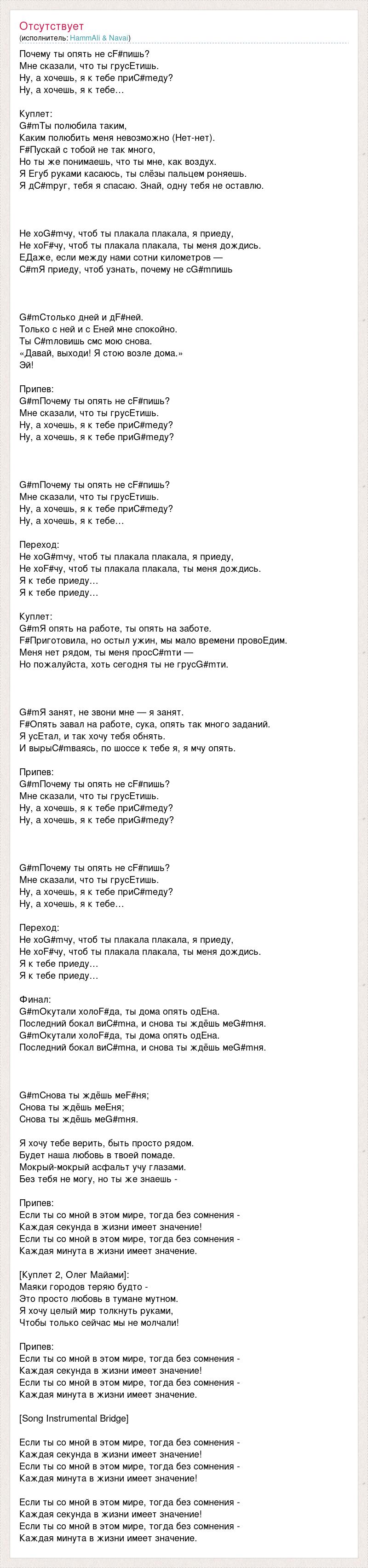 Почему ты опять не сF#пишь? Мне сказали, что ты грусEтишь. Ну, а хочешь, я к тебе приC#mеду? Ну, а хочешь, я к тебе… Куплет: G#mТы полюбила таким, Каким полюбить меня невозможно (Нет-нет). F#Пускай с тобой не так много, Но ты же понимаешь, что ты мне, как воздух. Я Eгуб руками касаюсь, ты слёзы пальцем роняешь. Я дC#mруг, тебя я спасаю. Знай, одну тебя не оставлю. Не хоG#mчу, чтоб ты плакала плакала, я приеду, Не хоF#чу, чтоб ты плакала плакала, ты меня дождись. EДаже, если между нами сотни километров — C#mЯ приеду, чтоб узнать, почему не сG#mпишь G#mСтолько дней и дF#ней. Только с ней и с Eней мне спокойно. Ты C#mловишь смс мою снова. «Давай, выходи! Я стою возле дома.» Эй! Припев: G#mПочему ты опять не сF#пишь? Мне сказали, что ты грусEтишь. Ну, а хочешь, я к тебе приC#mеду? Ну, а хочешь, я к тебе приG#mеду? G#mПочему ты опять не сF#пишь? Мне сказали, что ты грусEтишь. Ну, а хочешь, я к тебе приC#mеду? Ну, а хочешь, я к тебе… Переход: Не хоG#mчу, чтоб ты плакала плакала, я приеду, Не хоF#чу, чтоб ты плакала плакала, ты меня дождись. Я к тебе приеду… Я к тебе приеду… Куплет: G#mЯ опять на работе, ты опять на заботе. F#Приготовила, но остыл ужин, мы мало времени провоEдим. Меня нет рядом, ты меня просC#mти — Но пожалуйста, хоть сегодня ты не грусG#mти. G#mЯ занят, не звони мне — я занят. F#Опять завал на работе, сука, опять так много заданий. Я усEтал, и так хочу тебя обнять. И вырыC#mваясь, по шоссе к тебе я, я мчу опять. Припев: G#mПочему ты опять не сF#пишь? Мне сказали, что ты грусEтишь. Ну, а хочешь, я к тебе приC#mеду? Ну, а хочешь, я к тебе приG#mеду? G#mПочему ты опять не сF#пишь? Мне сказали, что ты грусEтишь. Ну, а хочешь, я к тебе приC#mеду? Ну, а хочешь, я к тебе… Переход: Не хоG#mчу, чтоб ты плакала плакала, я приеду, Не хоF#чу, чтоб ты плакала плакала, ты меня дождись. Я к тебе приеду… Я к тебе приеду… Финал: G#mОкутали холоF#да, ты дома опять одEна. Последний бокал виC#mна, и снова ты ждёшь меG#mня. G#mОкутали холоF#да, ты дома опять одEна. Последний бокал виC#mна, и снова ты ждёшь меG#mня. G#mСнова ты ждёшь меF#ня; Снова ты ждёшь меEня; Снова ты ждёшь меG#mня. Я хочу тебе верить, быть просто рядом. Будет наша любовь в твоей помаде. Мокрый-мокрый асфальт учу глазами. Без тебя не могу, но ты же знаешь - Припев: Если ты со мной в этом мире, тогда без сомнения - Каждая секунда в жизни имеет значение! Если ты со мной в этом мире, тогда без сомнения - Каждая минута в жизни имеет значение. [Куплет 2, Олег Майами]: Маяки городов теряю будто - Это просто любовь в тумане мутном. Я хочу целый мир толкнуть руками, Чтобы только сейчас мы не молчали! Припев: Если ты со мной в этом мире, тогда без сомнения - Каждая секунда в жизни имеет значение! Если ты со мной в этом мире, тогда без сомнения - Каждая минута в жизни имеет значение. [Song Instrumental Bridge] Если ты со мной в этом мире, тогда без сомнения - Каждая секунда в жизни имеет значение! Если ты со мной в этом мире, тогда без сомнения - Каждая минута в жизни имеет значение! Если ты со мной в этом мире, тогда без сомнения - Каждая секунда в жизни имеет значение! Если ты со мной в этом мире, тогда без сомнения - Каждая минута в жизни имеет значение.
