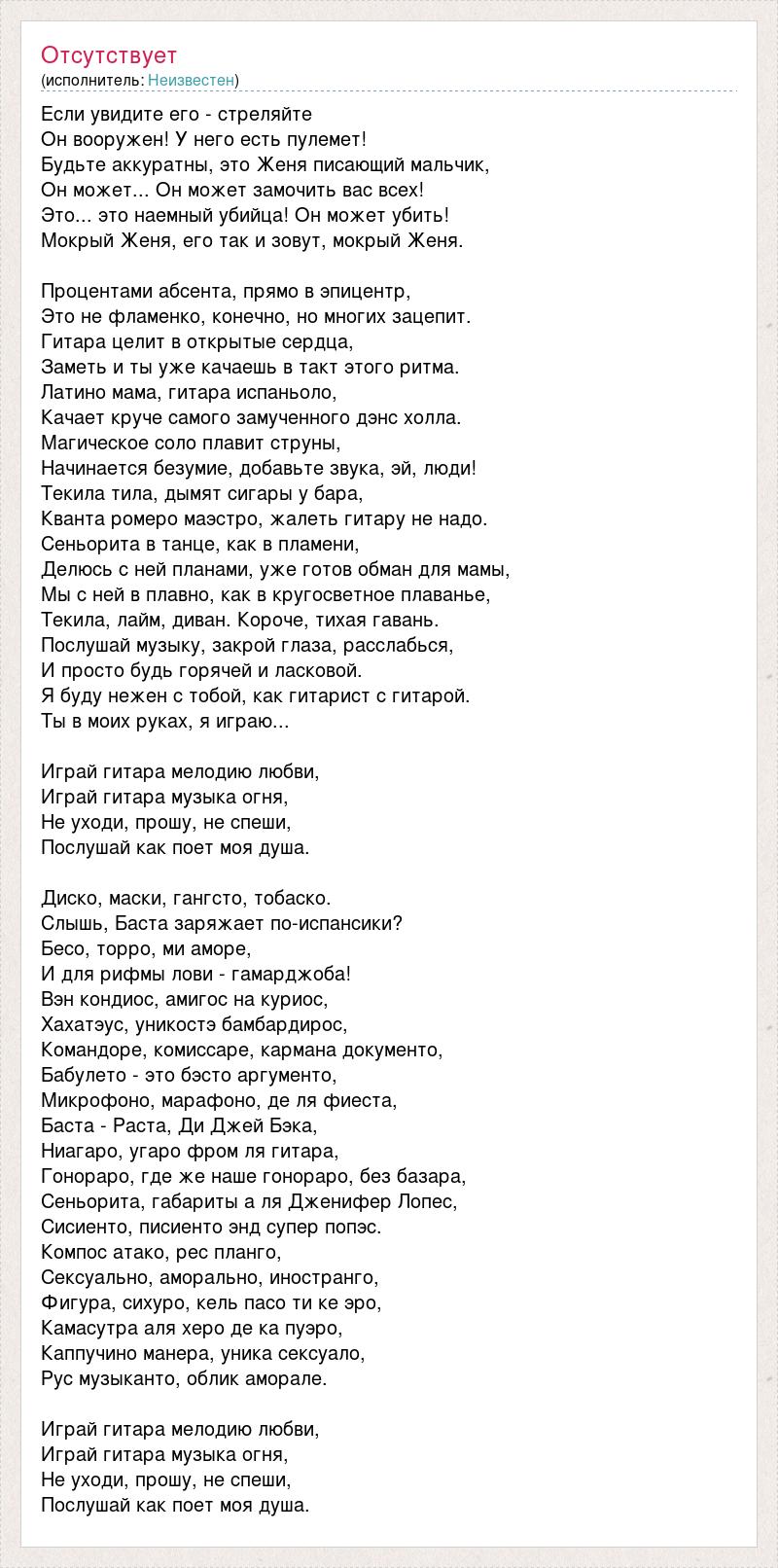 Если увидите его - стреляйте Он вооружен! У него есть пулемет! Будьте аккуратны, это Женя писающий мальчик, Он может... Он может замочить вас всех! Это... это наемный убийца! Он может убить! Мокрый Женя, его так и зовут, мокрый Женя. Процентами абсента, прямо в эпицентр, Это не фламенко, конечно, но многих зацепит. Гитара целит в открытые сердца, Заметь и ты уже качаешь в такт этого ритма. Латино мама, гитара испаньоло, Качает круче самого замученного дэнс холла. Магическое соло плавит струны, Начинается безумие, добавьте звука, эй, люди! Текила тила, дымят сигары у бара, Кванта ромеро маэстро, жалеть гитару не надо. Сеньорита в танце, как в пламени, Делюсь с ней планами, уже готов обман для мамы, Мы с ней в плавно, как в кругосветное плаванье, Текила, лайм, диван. Короче, тихая гавань. Послушай музыку, закрой глаза, расслабься, И просто будь горячей и ласковой. Я буду нежен с тобой, как гитарист с гитарой. Ты в моих руках, я играю... Играй гитара мелодию любви, Играй гитара музыка огня, Не уходи, прошу, не спеши, Послушай как поет моя душа. Диско, маски, гангсто, тобаско. Слышь, Баста заряжает по-испансики? Бесо, торро, ми аморе, И для рифмы лови - гамарджоба! Вэн кондиос, амигос на куриос, Хахатэус, уникостэ бамбардирос, Командоре, комиссаре, кармана документо, Бабулето - это бэсто аргументо, Микрофоно, марафоно, де ля фиеста, Баста - Раста, Ди Джей Бэка, Ниагаро, угаро фром ля гитара, Гонораро, где же наше гонораро, без базара, Сеньорита, габариты а ля Дженифер Лопес, Сисиенто, писиенто энд супер попэс. Компос атако, рес планго, Сексуально, аморально, иностранго, Фигура, сихуро, кель пасо ти ке эро, Камасутра аля херо де ка пуэро, Каппучино манера, уника сексуало, Рус музыканто, облик аморале. Играй гитара мелодию любви, Играй гитара музыка огня, Не уходи, прошу, не спеши, Послушай как поет моя душа.
