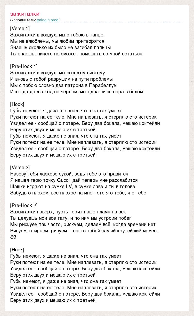 [Verse 1] Зажигалки в воздух, мы с тобою в танце Мы не влюблены, мы любим притворятся Знаешь сколько их было не загибая пальцы Ты знаешь, ничего не сможет помешать со мной остаться [Pre-Hook 1] Зажигалки в воздух, мы сожжём систему И вновь с тобой разрушим на пути проблемы Мы с тобою словно два патрона в Парабеллум И когда дресс-код на чёрном, мы одна лишь пара в белом [Hook] Губы немеют, я даже не знал, что она так умеет Руки потеют на ее теле. Мне наплевать, я стерплю сто истерик Увидел ее - сообщай о потере. Беру два бокала, мешаю коктейли Беру этих двух и мешаю их с третьей Губы немеют, я даже не знал, что она так умеет Руки потеют на ее теле. Мне наплевать, я стерплю сто истерик Увидел ее - сообщай о потере. Беру два бокала, мешаю коктейли Беру этих двух и мешаю их с третьей [Verse 2] Назову тебя ласково сукой, ведь тебе это нравится Я нашел твою точку Gucci, дай теперь мне расслабится Шашки играют на сумке LV, в сумке лавэ и ты в голове Забудь о плохом, все плохое на мне. -это я о тебе, я о тебе [Pre-Hook 2] Зажигалки наверх, пусть горит наше пламя на век Ты целуешь мои все тату, и по ним мы устроим побег Мы рискуем так часто, рискуем, делаем всё, когда времени нет Рисуем, стираем, рисуем, - наш с тобой самый крутейший момент Эй! [Hook] Губы немеют, я даже не знал, что она так умеет Руки потеют на ее теле. Мне наплевать, я стерплю сто истерик Увидел ее - сообщай о потере. Беру два бокала, мешаю коктейли Беру этих двух и мешаю их с третьей Губы немеют, я даже не знал, что она так умеет Руки потеют на ее теле. Мне наплевать, я стерплю сто истерик Увидел ее - сообщай о потере. Беру два бокала, мешаю коктейли Беру этих двух и мешаю их с третьей