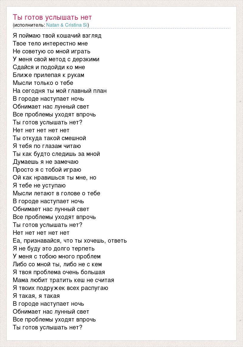 Я поймаю твой кошачий взгляд Твое тело интерестно мне Не советую со мной играть У меня свой метод с дерзкими Сдайся и подойди ко мне Ближе прилепая к рукам Мысли только о тебе На сегодня ты мой главный план В городе наступает ночь Обнимает нас лунный свет Все проблемы уходят впрочь Ты готов услышать нет? Нет нет нет нет нет Ты откуда такой смешной Я тебя по глазам читаю Ты как будто следишь за мной Думаешь я не замечаю Просто я с тобой играю Ой как нравишься ты мне, но Я тебе не уступаю Мысли летают в голове о тебе В городе наступает ночь Обнимает нас лунный свет Все проблемы уходят впрочь Ты готов услышать нет? Нет нет нет нет нет Еа, признавайся, что ты хочешь, ответь Я не буду это долго терпеть У меня с тобою много проблем Либо со мной ты, либо не с кем Я твоя проблема очень большая Мама любит тратить кеш не считая Я твоих подружек всех распугаю Я такая, я такая В городе наступает ночь Обнимает нас лунный свет Все проблемы уходят впрочь Ты готов услышать нет?