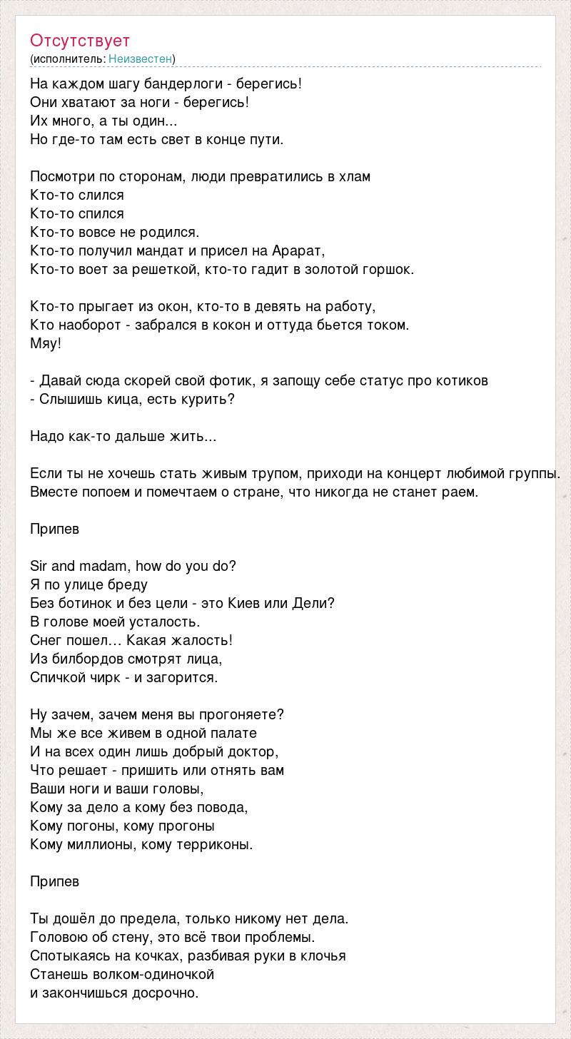 На каждом шагу бандерлоги - берегись! Они хватают за ноги - берегись! Их много, а ты один... Но где-то там есть свет в конце пути. Посмотри по сторонам, люди превратились в хлам Кто-то слился Кто-то спился Кто-то вовсе не родился. Кто-то получил мандат и присел на Арарат, Кто-то воет за решеткой, кто-то гадит в золотой горшок. Кто-то прыгает из окон, кто-то в девять на работу, Кто наоборот - забрался в кокон и оттуда бьется током. Мяу! - Давай сюда скорей свой фотик, я запощу себе статус про котиков - Слышишь кица, есть курить? Надо как-то дальше жить... Если ты не хочешь стать живым трупом, приходи на концерт любимой группы. Вместе попоем и помечтаем о стране, что никогда не станет раем. Припев Sir and madam, how do you do? Я по улице бреду Без ботинок и без цели - это Киев или Дели? В голове моей усталость. Снег пошел… Какая жалость! Из билбордов смотрят лица, Спичкой чирк - и загорится. Ну зачем, зачем меня вы прогоняете? Мы же все живем в одной палате И на всех один лишь добрый доктор, Что решает - пришить или отнять вам Ваши ноги и ваши головы, Кому за дело а кому без повода, Кому погоны, кому прогоны Кому миллионы, кому терриконы. Припев Ты дошёл до предела, только никому нет дела. Головою об стену, это всё твои проблемы. Спотыкаясь на кочках, разбивая руки в клочья Станешь волком-одиночкой и закончишься досрочно.