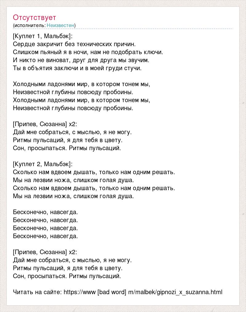 [Куплет 1, Мальбэк]: Сердце закричит без технических причин. Слишком пьяный я в ночи, нам не подобрать ключи. И никто не виноват, друг для друга мы звучим. Ты в объятия заключи и в моей груди стучи. Холодными ладонями мир, в котором тонем мы, Неизвестной глубины повсюду пробоины. Холодными ладонями мир, в котором тонем мы, Неизвестной глубины повсюду пробоины. [Припев, Сюзанна] х2: Дай мне собраться, с мыслью, я не могу. Ритмы пульсаций, я для тебя в цвету. Сон, просыпаться. Ритмы пульсаций. [Куплет 2, Мальбэк]: Сколько нам вдвоем дышать, только нам одним решать. Мы на лезвии ножа, слишком голая душа. Сколько нам вдвоем дышать, только нам одним решать. Мы на лезвии ножа, слишком голая душа. Бесконечно, навсегда. Бесконечно, навсегда. Бесконечно, навсегда. Бесконечно, навсегда. [Припев, Сюзанна] х2: Дай мне собраться, с мыслью, я не могу. Ритмы пульсаций, я для тебя в цвету. Сон, просыпаться. Ритмы пульсаций. Читать на сайте: https://www [bad word] m/malbek/gipnozi_x_suzanna.html