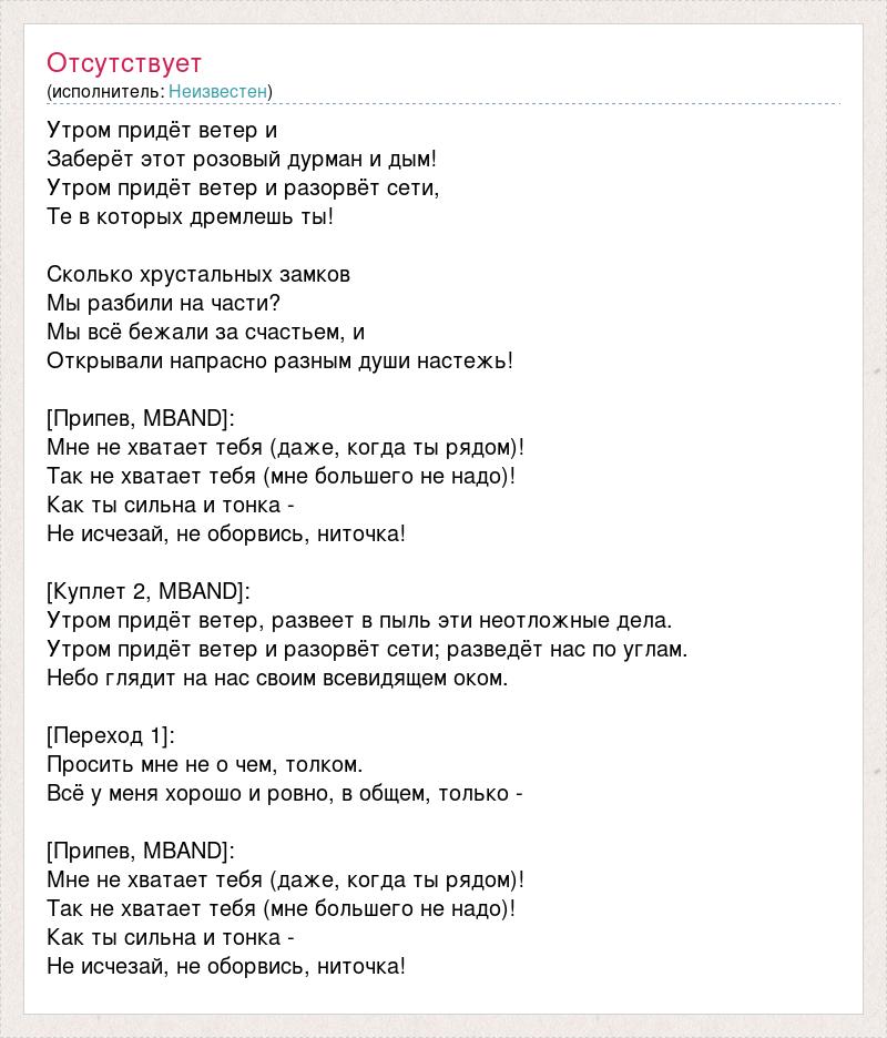 Утром придёт ветер и Заберёт этот розовый дурман и дым! Утром придёт ветер и разорвёт сети, Те в которых дремлешь ты! Сколько хрустальных замков Мы разбили на части? Мы всё бежали за счастьем, и Открывали напрасно разным души настежь! [Припев, MBAND]: Мне не хватает тебя (даже, когда ты рядом)! Так не хватает тебя (мне большего не надо)! Как ты сильна и тонка - Не исчезай, не оборвись, ниточка! [Куплет 2, MBAND]: Утром придёт ветер, развеет в пыль эти неотложные дела. Утром придёт ветер и разорвёт сети; разведёт нас по углам. Небо глядит на нас своим всевидящем оком. [Переход 1]: Просить мне не о чем, толком. Всё у меня хорошо и ровно, в общем, только - [Припев, MBAND]: Мне не хватает тебя (даже, когда ты рядом)! Так не хватает тебя (мне большего не надо)! Как ты сильна и тонка - Не исчезай, не оборвись, ниточка!