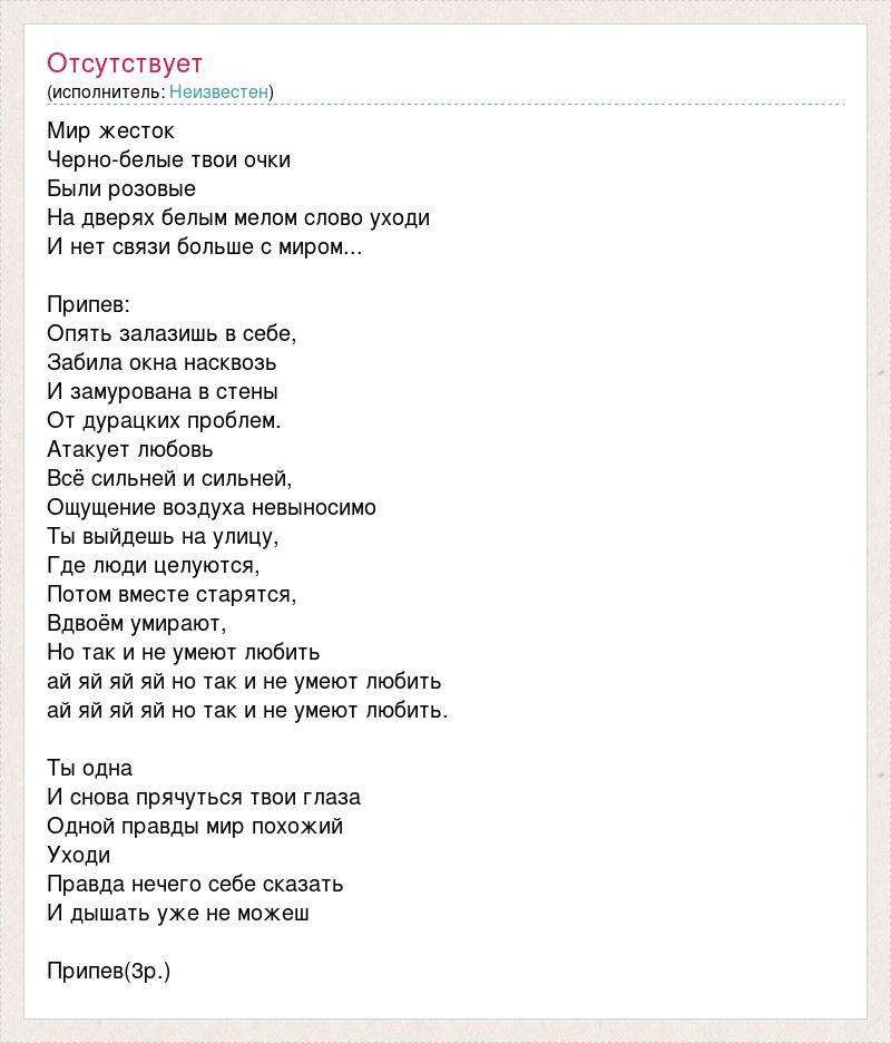 Мир жесток Черно-белые твои очки Были розовые На дверях белым мелом слово уходи И нет связи больше с миром... Припев: Опять залазишь в себе, Забила окна насквозь И замурована в стены От дурацких проблем. Атакует любовь Всё сильней и сильней, Ощущение воздуха невыносимо Ты выйдешь на улицу, Где люди целуются, Потом вместе старятся, Вдвоём умирают, Но так и не умеют любить ай яй яй яй но так и не умеют любить ай яй яй яй но так и не умеют любить. Ты одна И снова прячуться твои глаза Одной правды мир похожий Уходи Правда нечего себе сказать И дышать уже не можеш Припев(3р.)