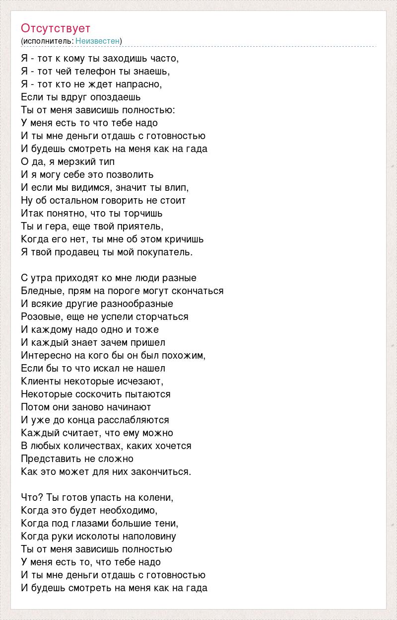 Я - тот к кому ты заходишь часто, Я - тот чей телефон ты знаешь, Я - тот кто не ждет напрасно, Если ты вдруг опоздаешь Ты от меня зависишь полностью: У меня есть то что тебе надо И ты мне деньги отдашь с готовностью И будешь смотреть на меня как на гада О да, я мерзкий тип И я могу себе это позволить И если мы видимся, значит ты влип, Ну об остальном говорить не стоит Итак понятно, что ты торчишь Ты и гера, еще твой приятель, Когда его нет, ты мне об этом кричишь Я твой продавец ты мой покупатель. С утра приходят ко мне люди разные Бледные, прям на пороге могут скончаться И всякие другие разнообразные Розовые, еще не успели сторчаться И каждому надо одно и тоже И каждый знает зачем пришел Интересно на кого бы он был похожим, Если бы то что искал не нашел Клиенты некоторые исчезают, Некоторые соскочить пытаются Потом они заново начинают И уже до конца расслабляются Каждый считает, что ему можно В любых количествах, каких хочется Представить не сложно Как это может для них закончиться. Что? Ты готов упасть на колени, Когда это будет необходимо, Когда под глазами большие тени, Когда руки исколоты наполовину Ты от меня зависишь полностью У меня есть то, что тебе надо И ты мне деньги отдашь с готовностью И будешь смотреть на меня как на гада